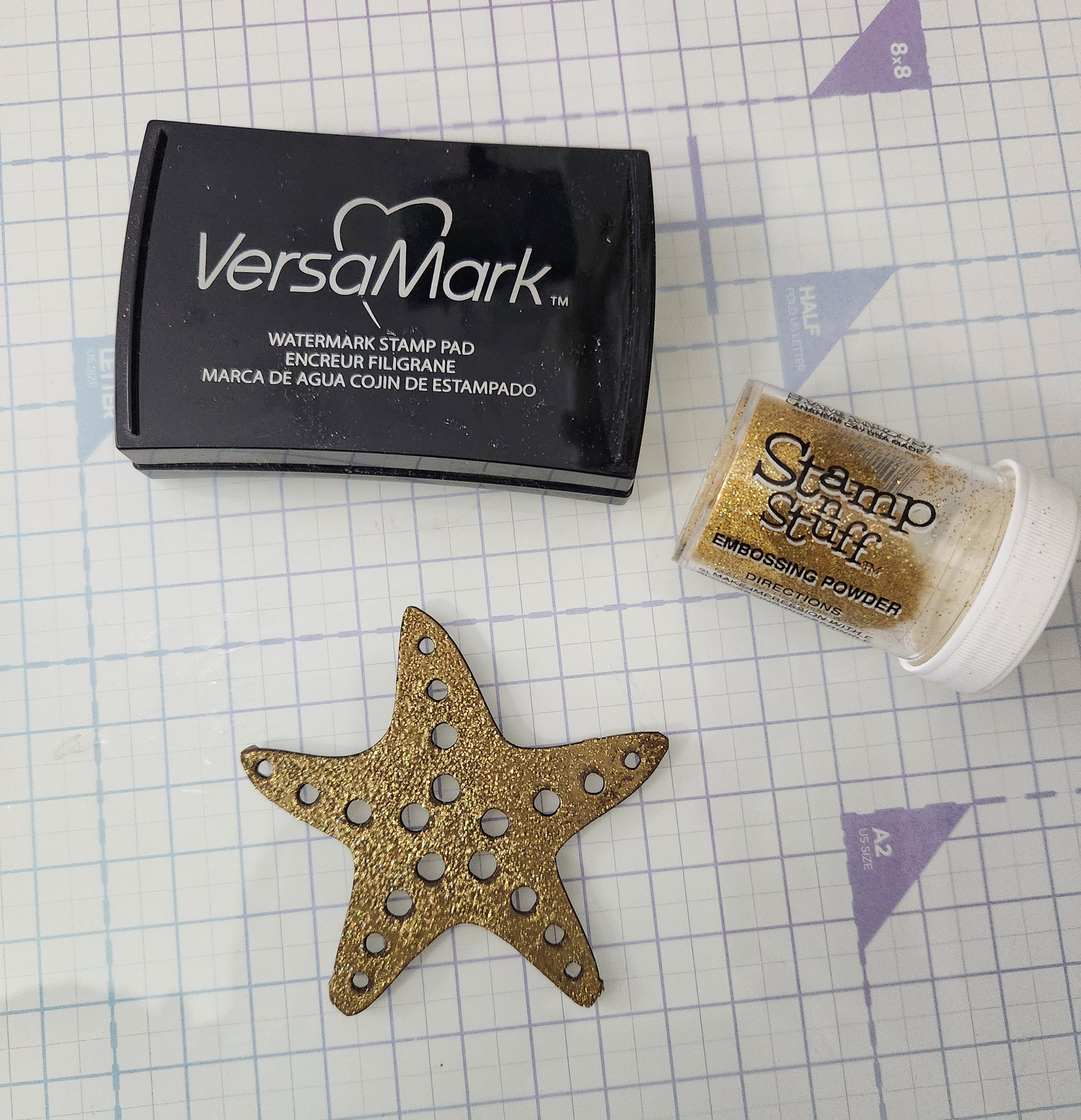 Set your card aside for now. Cut apart the Starfish from your chipboard frame. Take some Versamark Clear ink and apply over the top of your Starfish chipboard embellishment. Then sprinkle some Jeweled Gold embossing powder over the top. Shake off any excess embossing powder. Heat emboss with your heat tool. Set aside. Here's a photo:
