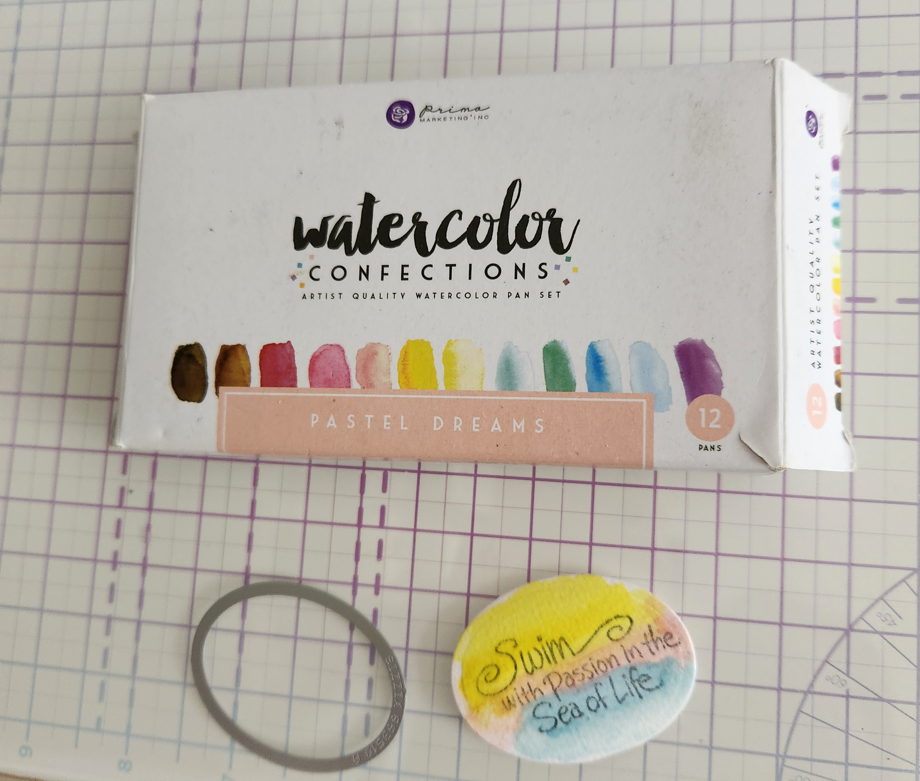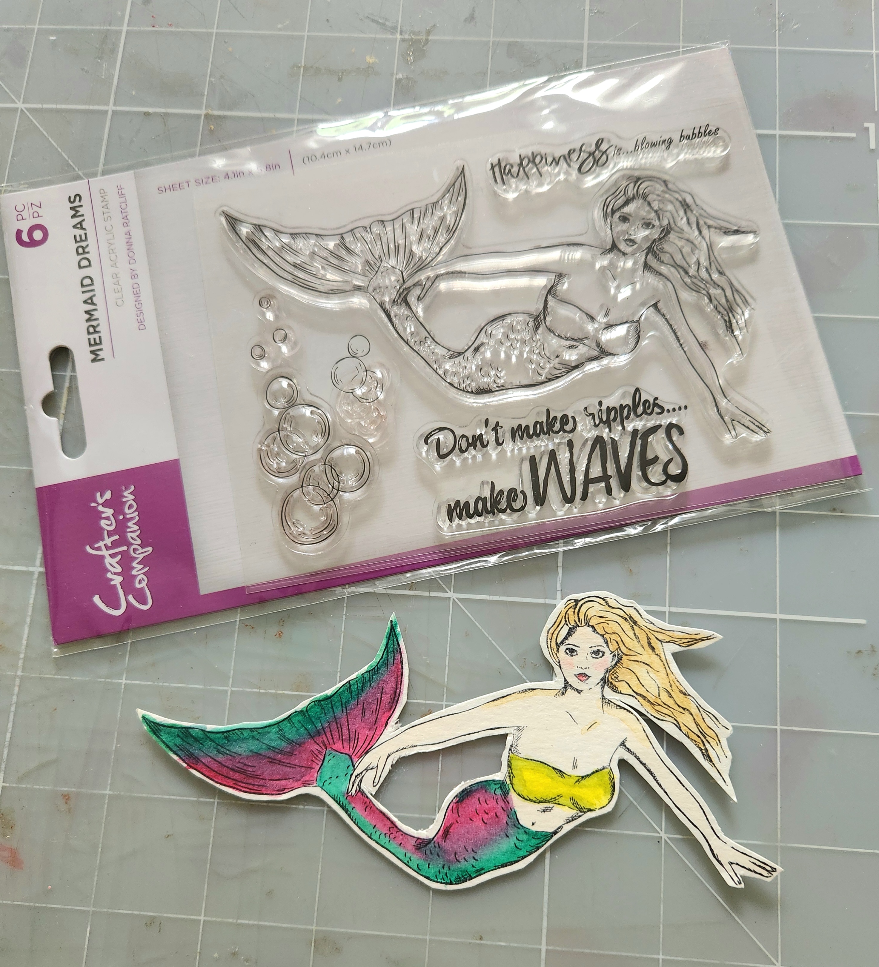 Taking some watercolor paper and a mermaid stamp set from my stash, I stamped my mermaid and sentiment onto my watercolor paper. I colored my mermaid stamped image and sentiment background using Spectrum Noir Sparkle pens and Prima marketing Watercolor confections. See photos below:
