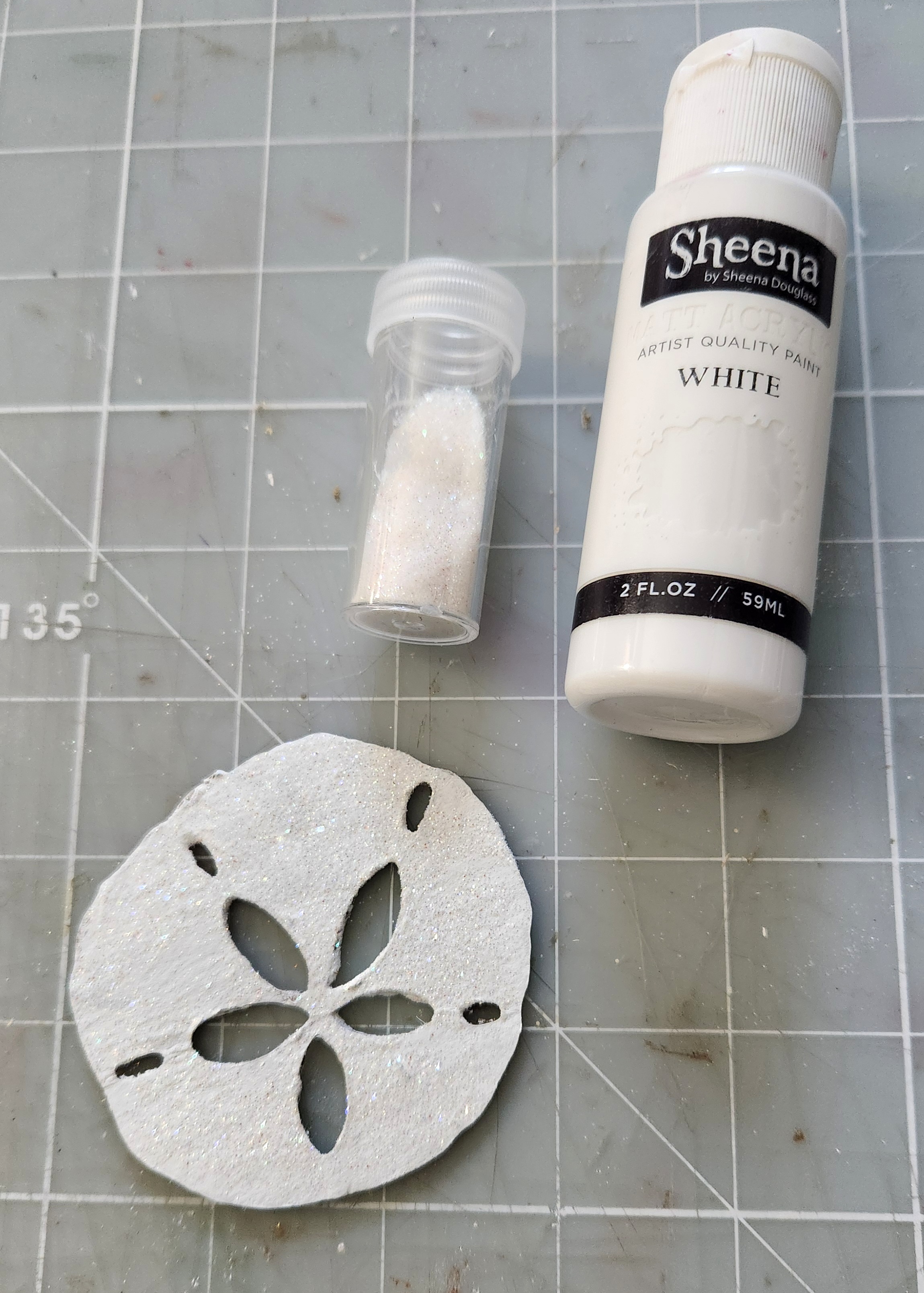 Card 2: cut apart the Sand dollar chipboard embellishment and save the outer chipboard frame. I painted my Sand dollar chipboard piece using some white acrylic paint. Then sprinkled some crystal glitter over the top while your paint is still wet. Shake off any excess glitter. Set aside to dry.