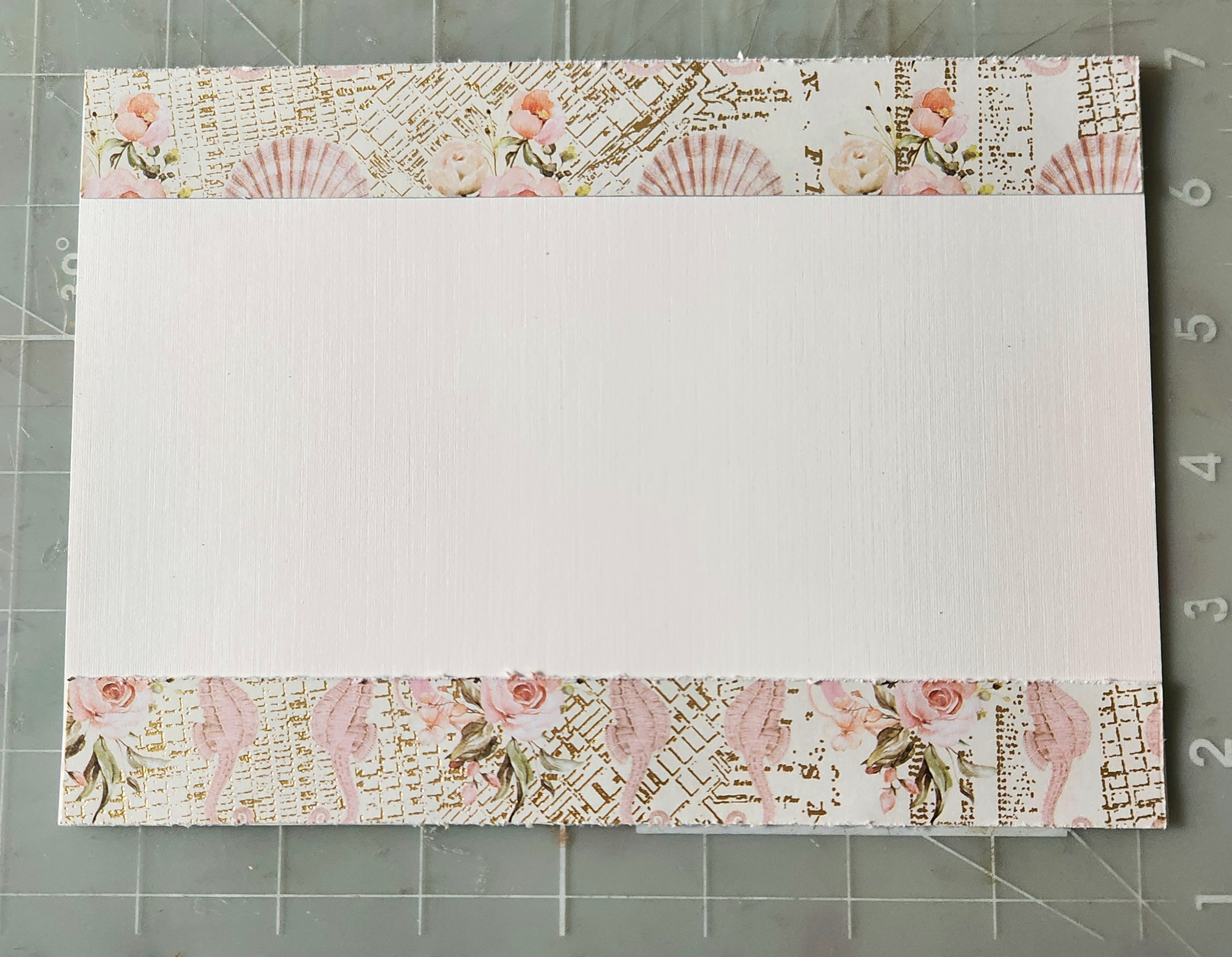 Card 3: I will be using a 6×6 card base for this card. I cut a piece of patterned roses paper to measure 5 & 3/4 x 5 & 3/4 inches. I adhered to the front of my card base using foam tape.