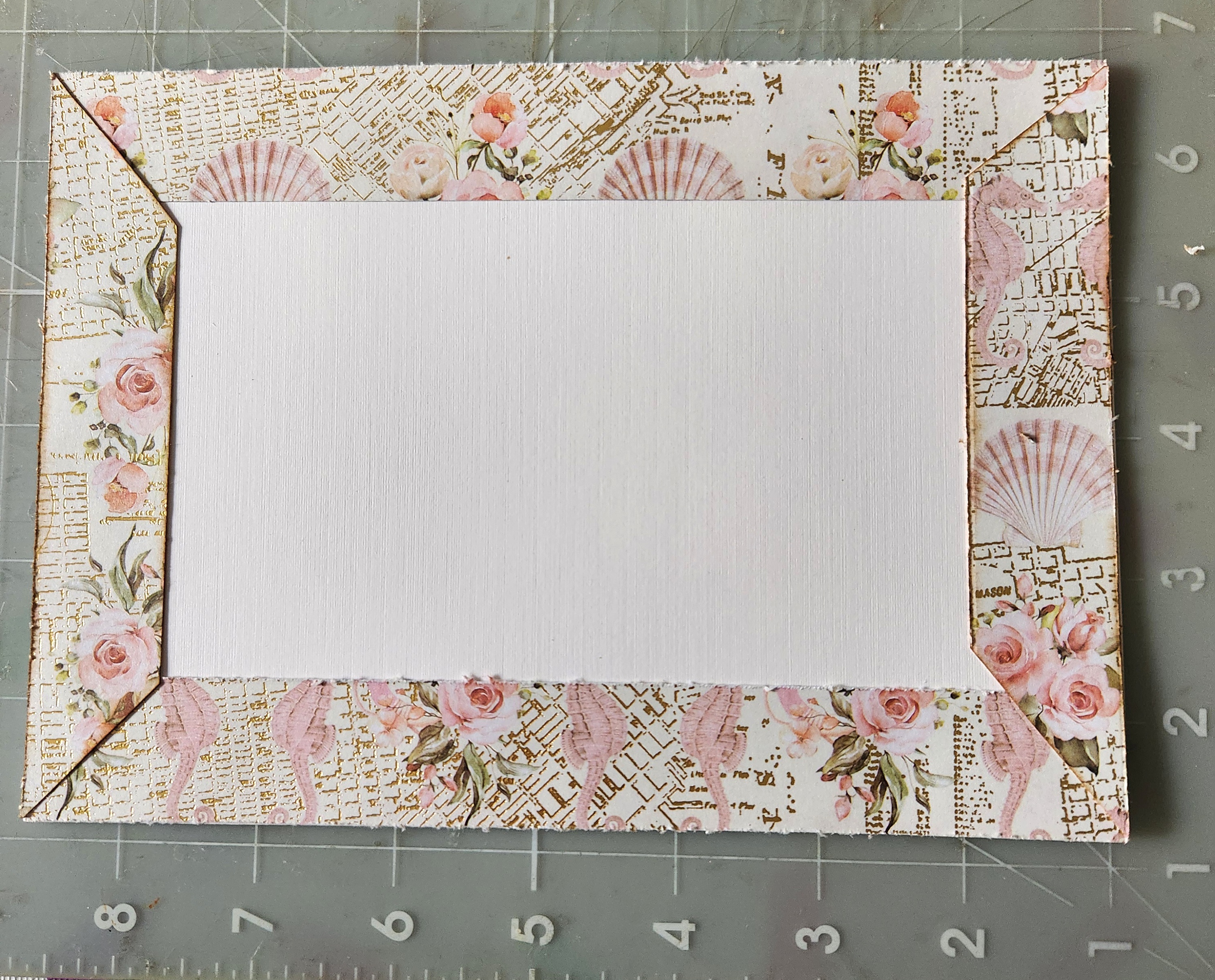 Now take a card base that measures 7 & 3/4 x 5 & 1/2 inches. Taking my scraps of patterned paper and cut 2 strips measuring 5 & 1/2 x 1 inch. Cut another two strips measuring 7 3/4 x 1 inch. I mitered all four corners and adhered all 4 strips onto the front of my card base. See photos: