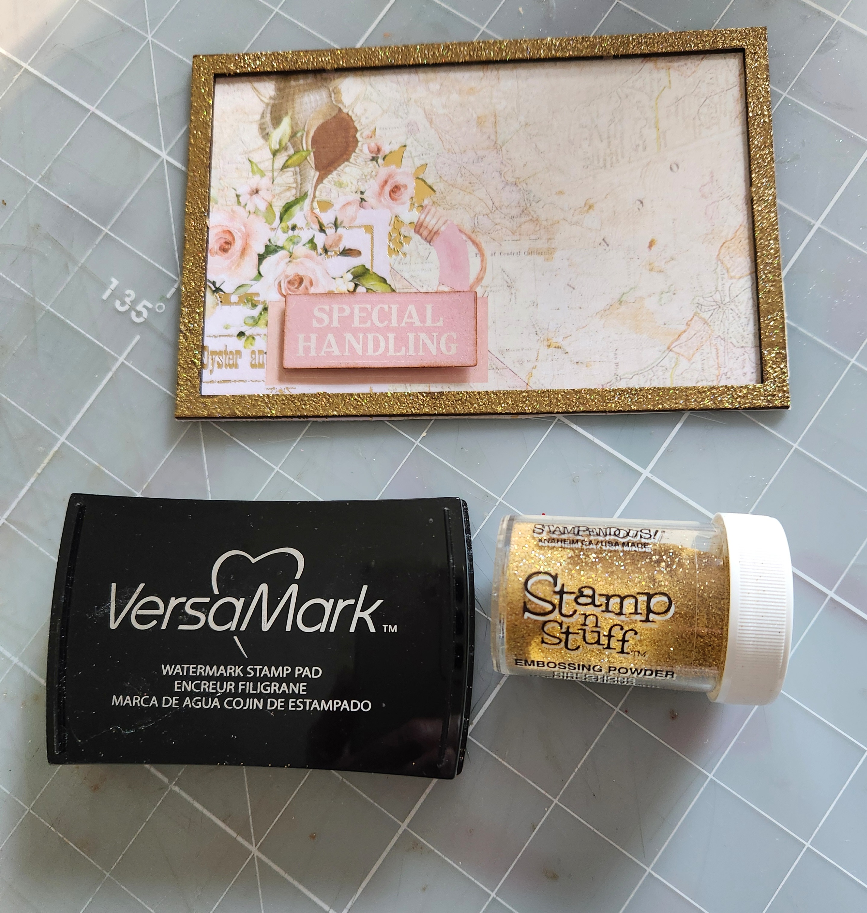 Set aside your card. Now take your leftover chipboard frame, apply some Versamark Clear ink over all 4 edges. Then sprinkle Gold glitter embossing powder, shake off any excess. Then heat emboss. Now taking a 4×6 inches journal card, I glued it behind my chipboard frame. Here a photo: