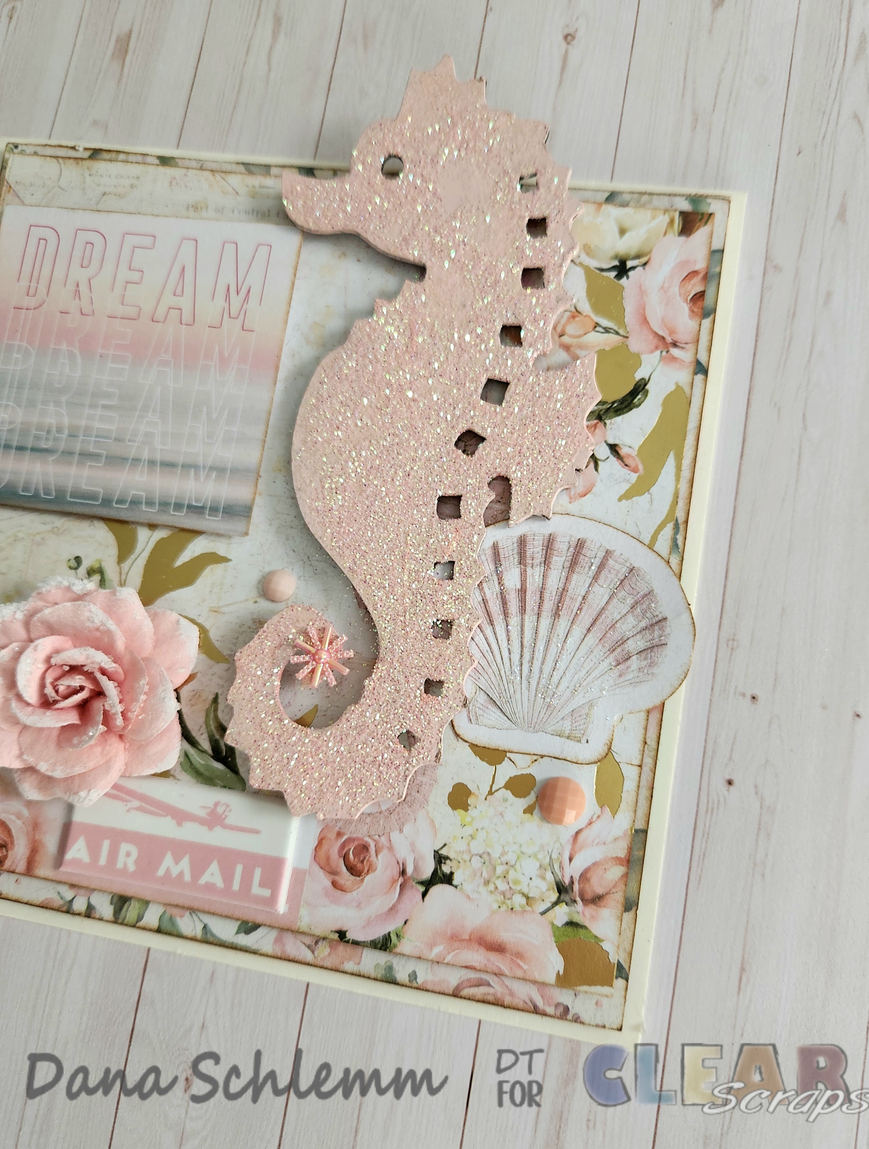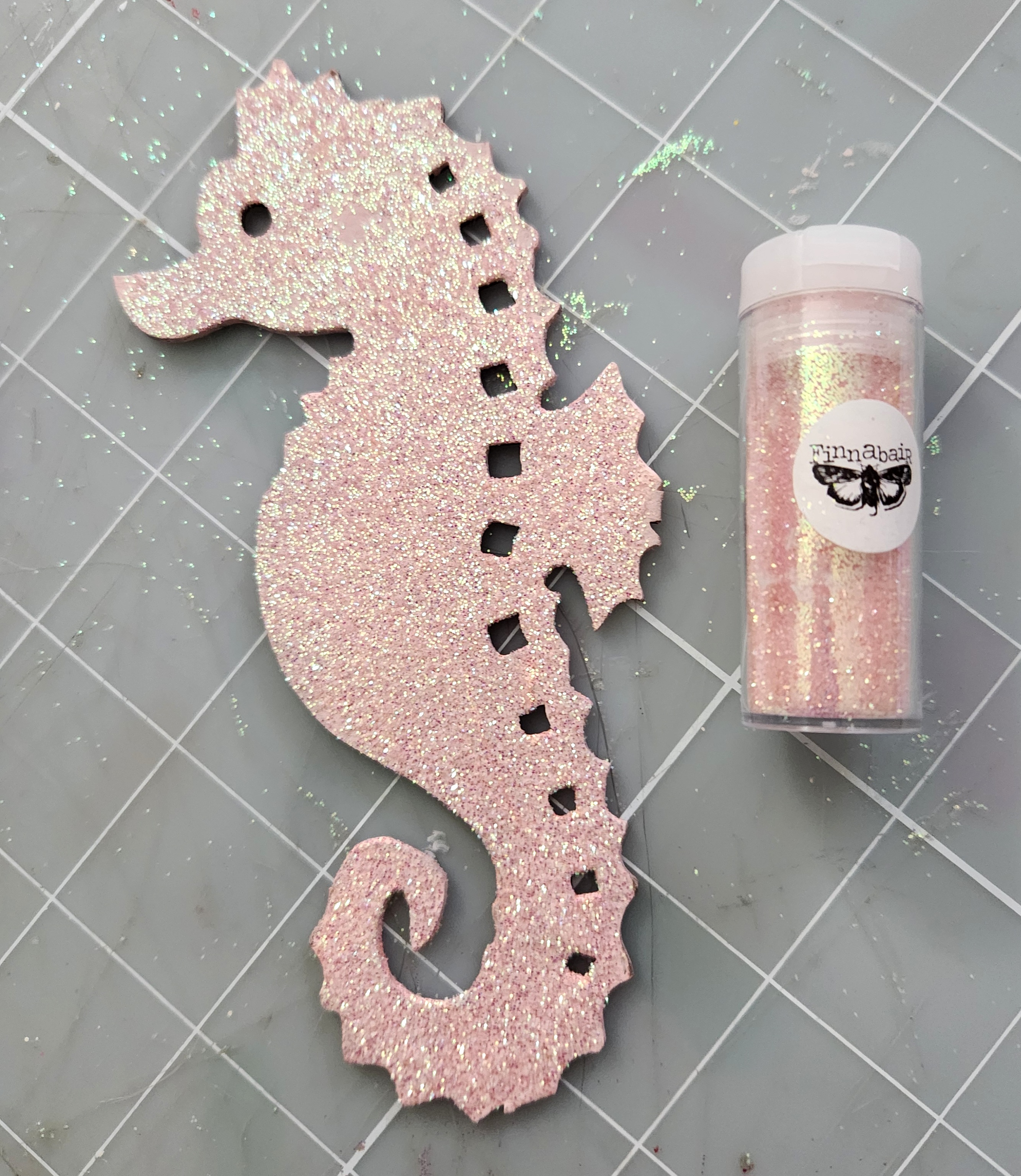 The next layered patterned paper measures 5 & 1/2 x 5 & 1/2 inches. I also adhered using foam tape. This adds some dimension to your cards which I really love. Set aside your card for now. Cut apart your Seahorse Chipboard Embellishment. I painted over the top using Folkart Conch Shell acrylic paint. While my paint is still wet, i sprinkled some Finnibair Pink glitter over the top. Who says a Seahorse can't be pink! Shake off any excess glitter. Set aside to dry.