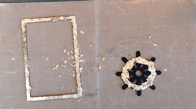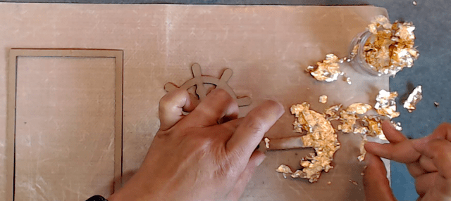 Next we are going to decorate the chipboard pieces using gold leaf, this is a light weight paper that is flaky and sticks to the adhesive. We are going to use the chipboard frame from the