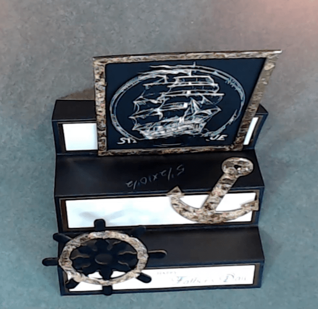Next I adhered on the frame in the back, anchor and helm. I also stamped a sentiment in the front of the card next to the helm. Since the frame is on the back of the card and it is a bit heavy I added a little stopper.