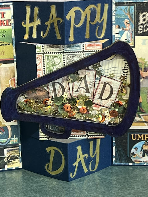 Shaker Megaphone placed on the middle panel of the card. I added Happy Day in gold stickers from my stash. .