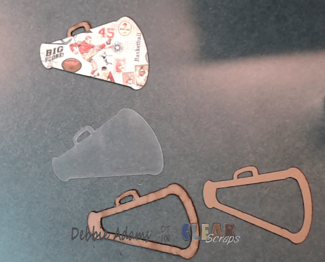 megaphone. You then want to adhere two of the megaphone frames together, then remove the film from the acetate and adhere the acetate on top of the frames you just adhered together. The last frame you can paint, or color in with markers or any thing you would like, then adhere on top of the acetate.