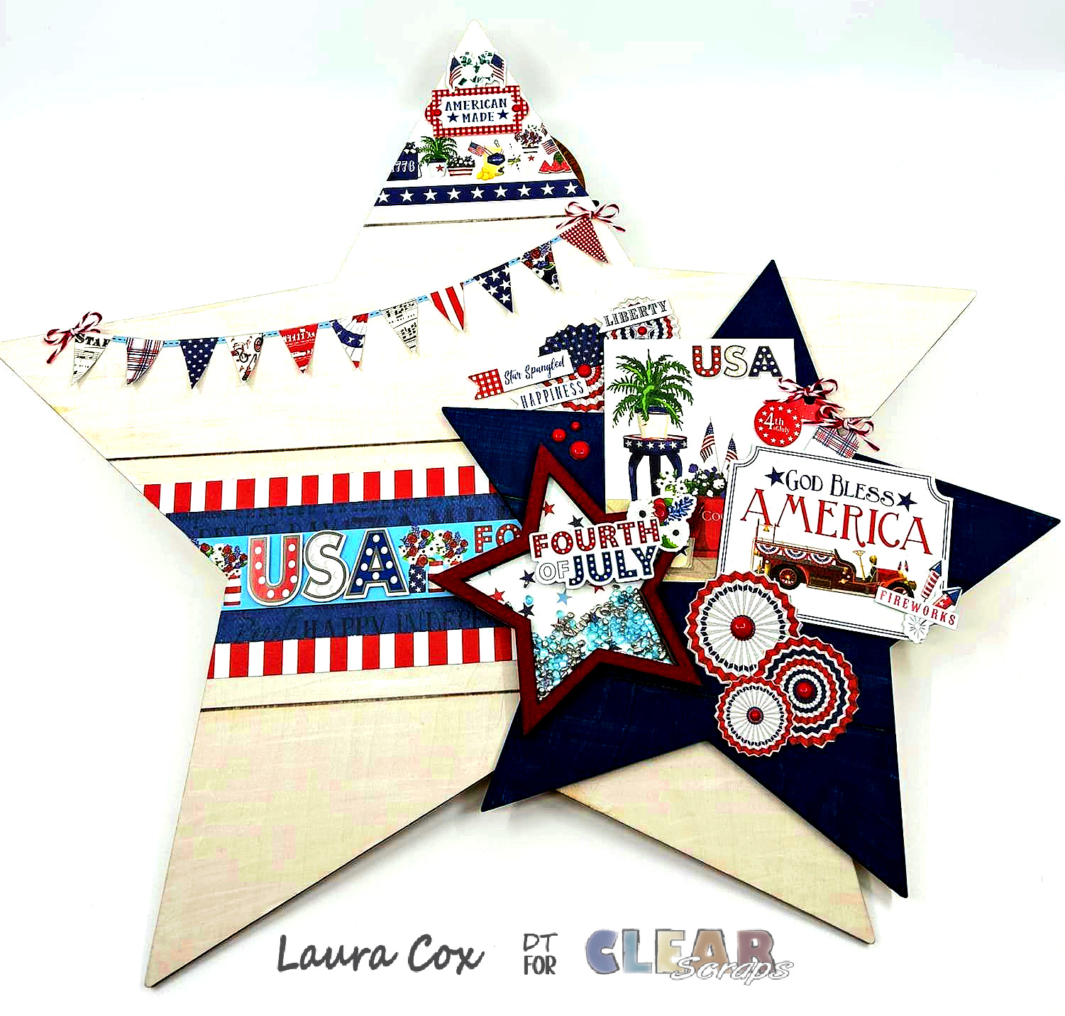 July will be here before we know it, and wouldn't it be fun to create a great home decor piece to display on your door or on your table as a festive decoration? This one starts with two of the Clear Scraps Shiplap Shapes. The Star Shiplap Shape Medium and Large. The large was painted with white acrylic paint and the medium was painted with navy acrylic paint. To decorate the medium sized star, I also used one of the Clear Scraps Mini Shaker Star. I painted the top frame red and traced the back base piece onto a star patterned paper. The layers were then glued together, with some beads being added before the acrylic layer was glued down. Next up was to used the Mini Shaker and some embellishments to decorate the blue star.