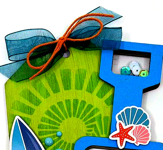 Other: acrylic paint–blue, green, distress ink, sequins, enamel dots, foam tape, organza ribbon, twine, Echo Park Endless Summer stickers.