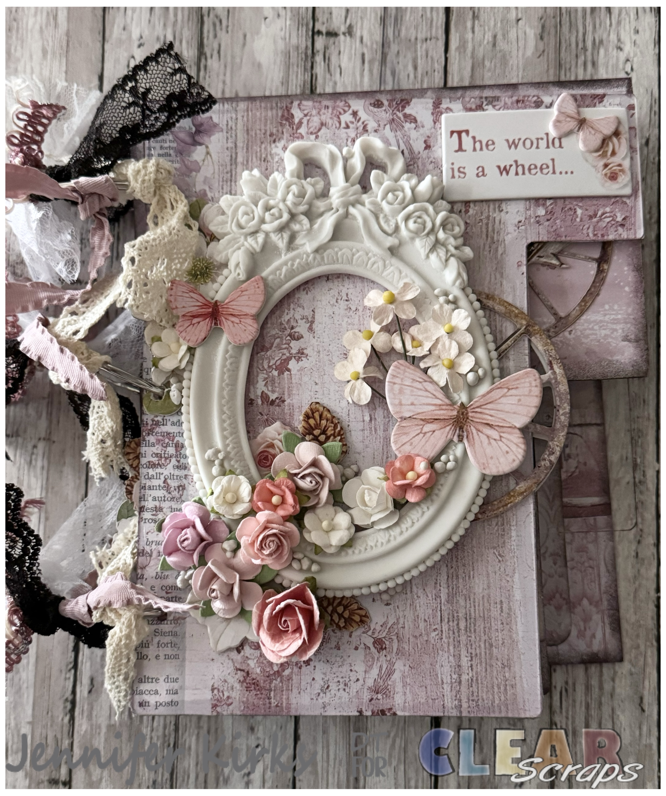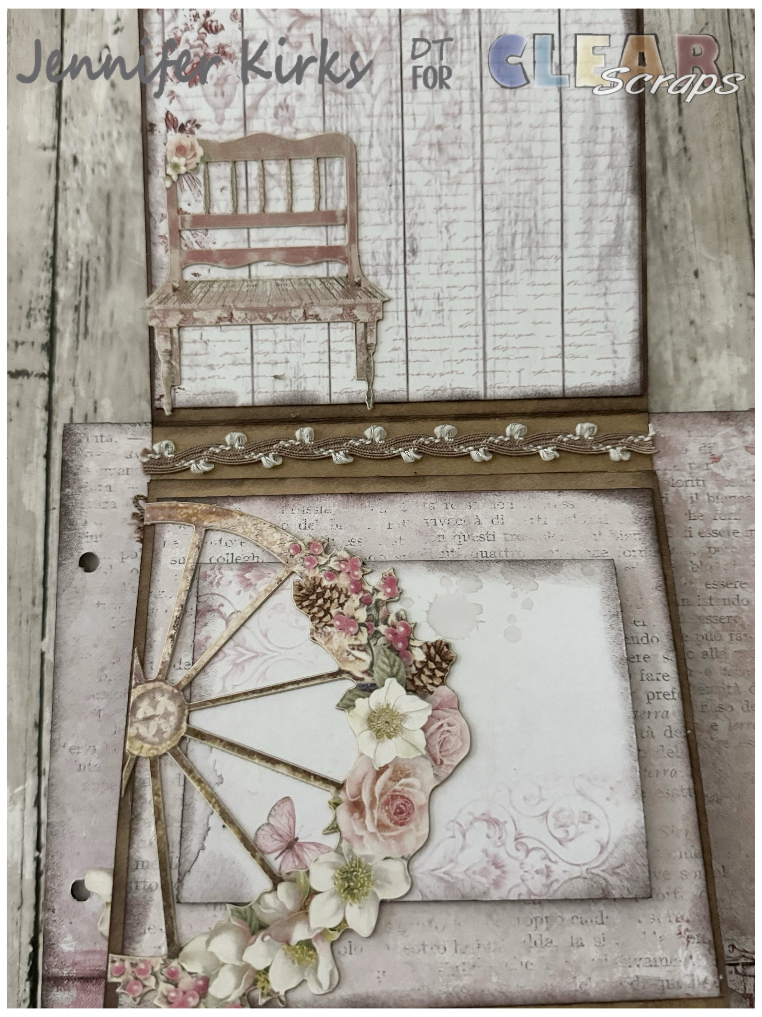 On the front side of the chipboard piece, I adorned it with pink printed paper and included a photo mat. I then enhanced the design with a variety of ephemera pieces, flowers, and additional chipboard elements. On the back, I chose pink lace paper for coverage. Following this, I cut a 3×7 piece of paper and tore it along the 7-inch line, inked it, and carefully glued the top, bottom, and sides to craft a pocket. Within this pocket, I inserted tags and photo cards. To finish, I adorned the piece with flowers and additional ephemera pieces.I enhanced the bottom of the page by incorporating brown lace, adorned with a delicate pink ribbon layered on top for an added touch of elegance.