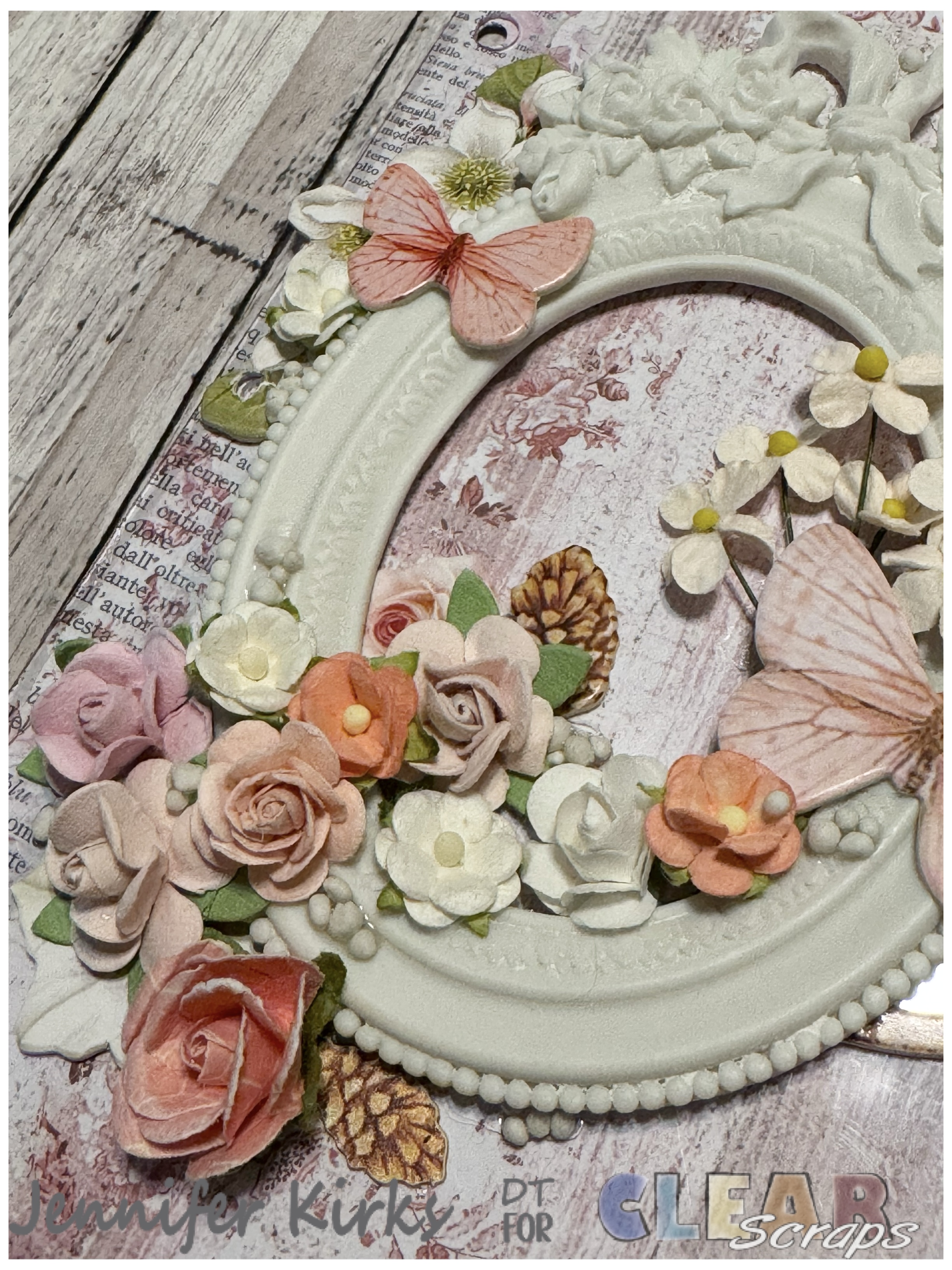 To prepare the front cover acrylic piece, I first removed the protective film from the front side, ensuring a clear surface for decorating. I opted to leave the film on the back side until I was ready to decorate, safeguarding it from potential scratching or damage. Next, Iincorporated a clay frame as the centerpiece, embellished with a lovely array of flowers and butterflies. To impart a delicate touch, I sprinkled in some white art stones.