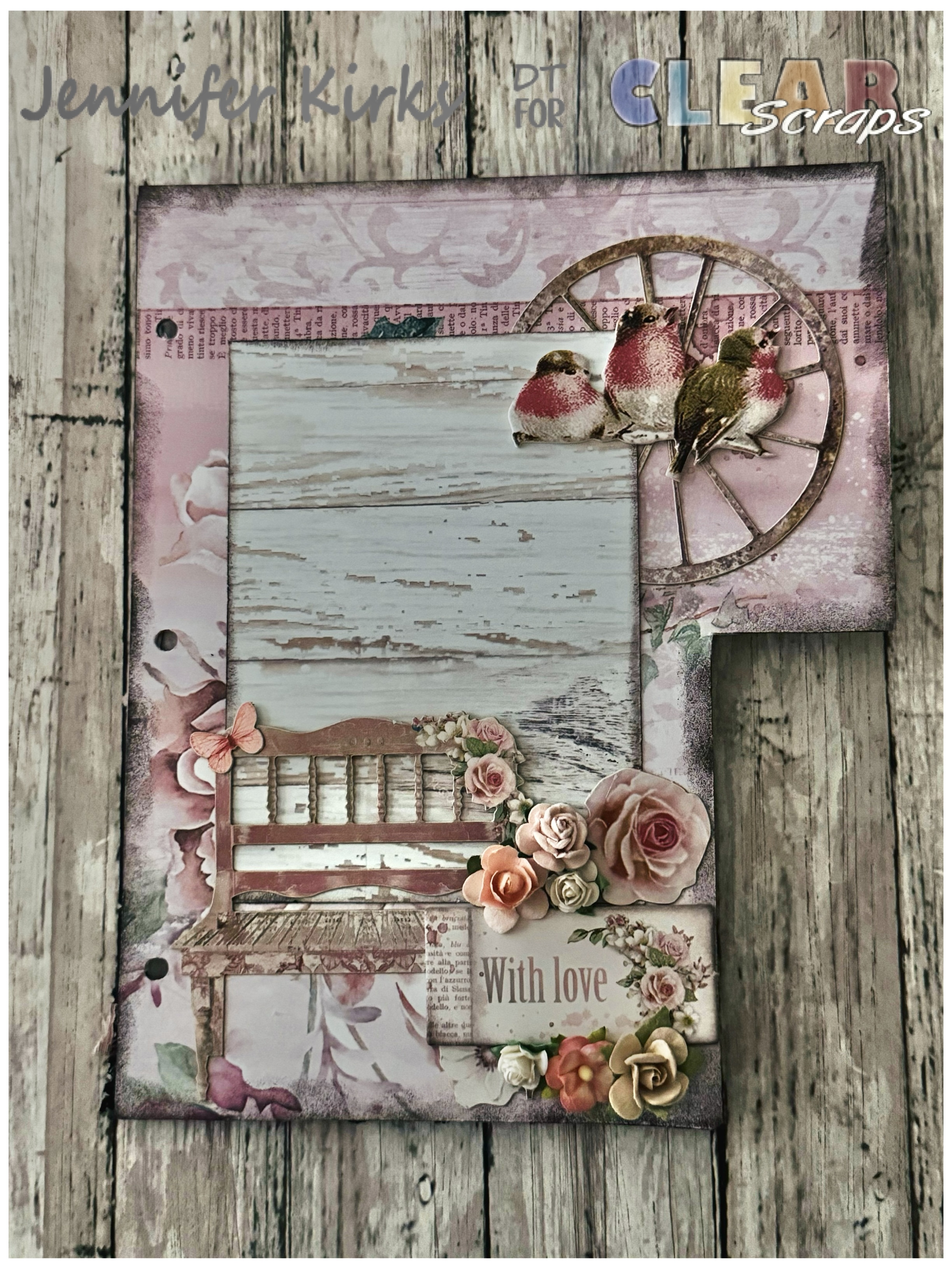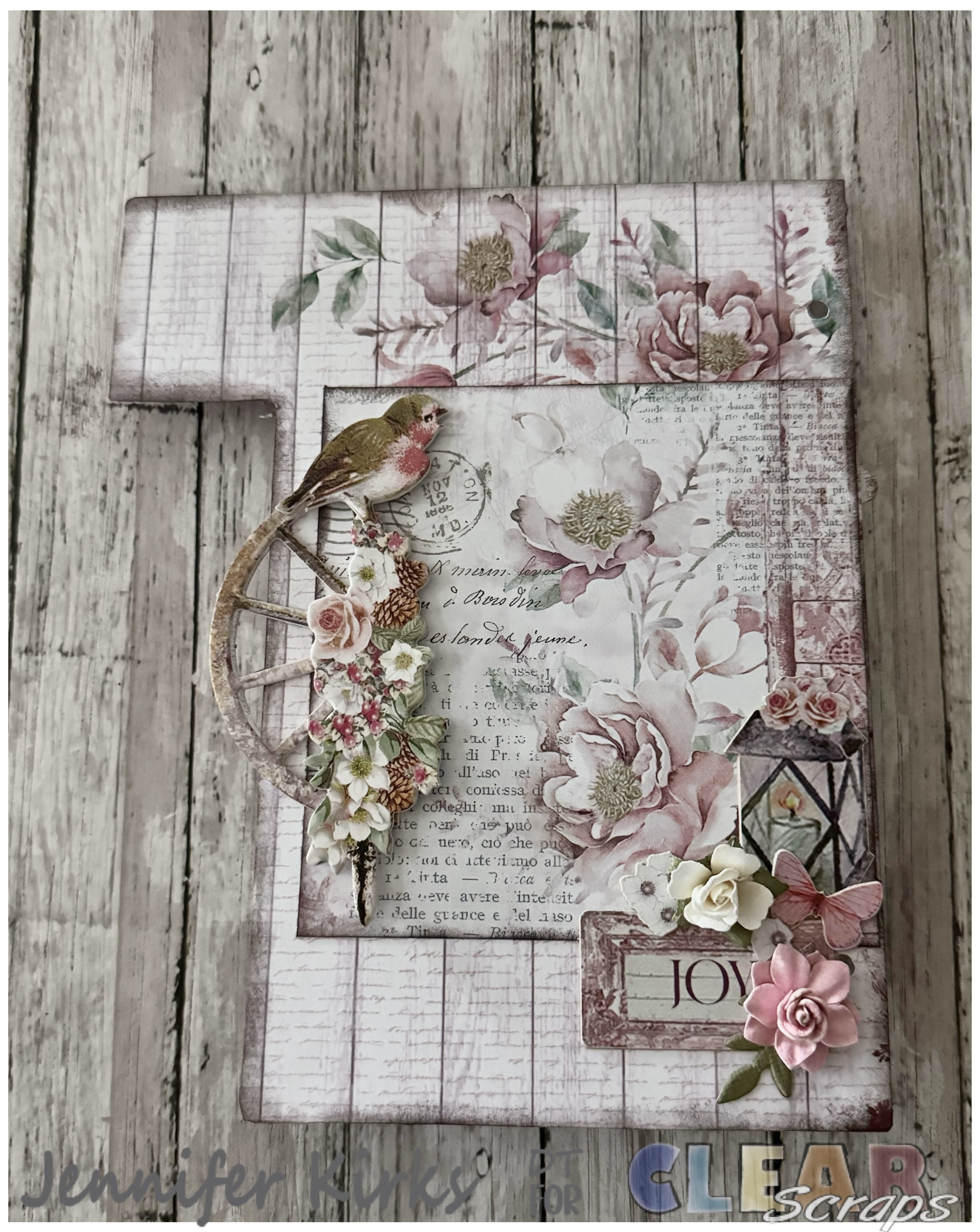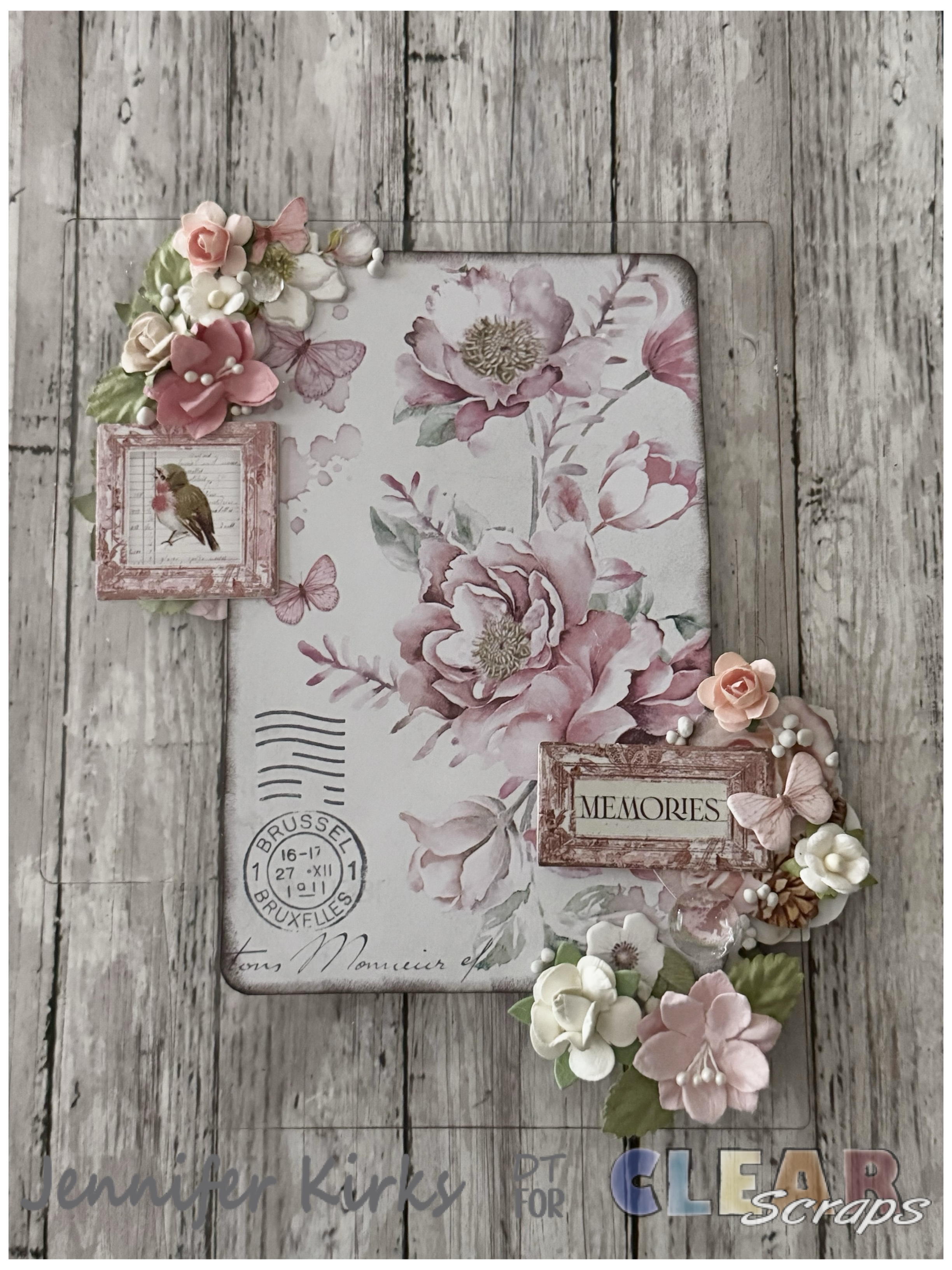 For the back of the front piece, I opted for a pink shiplap paper adorned with flowers for the backside of the acrylic piece, providing a charming base page visible from the front. I incorporated a photo mat and additional embellishments to finalize the design.