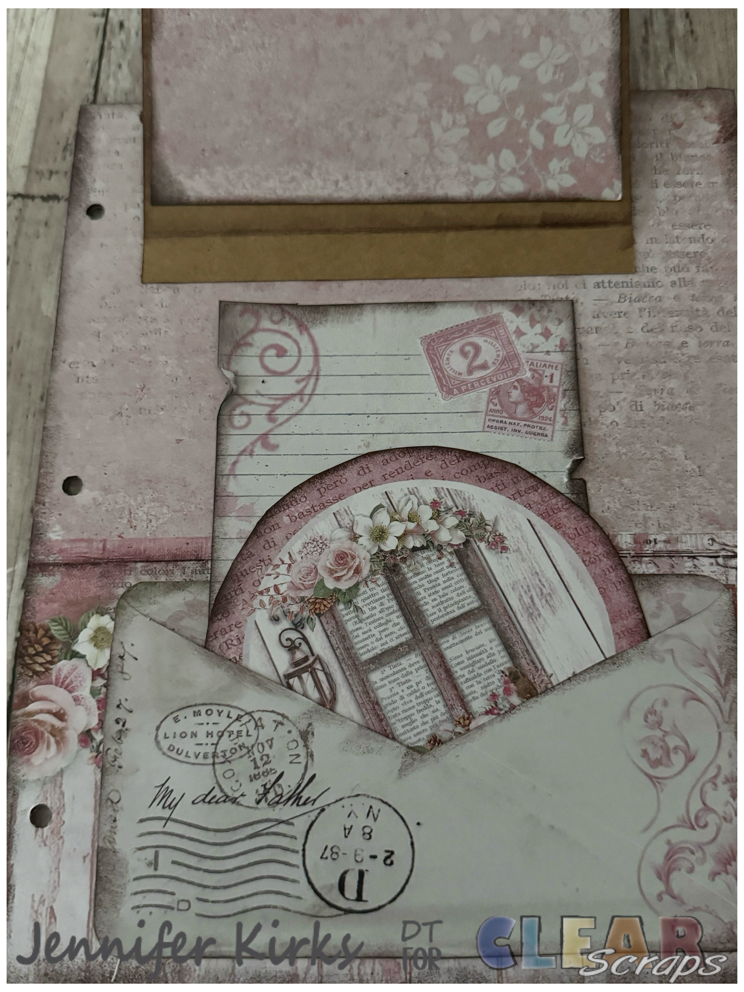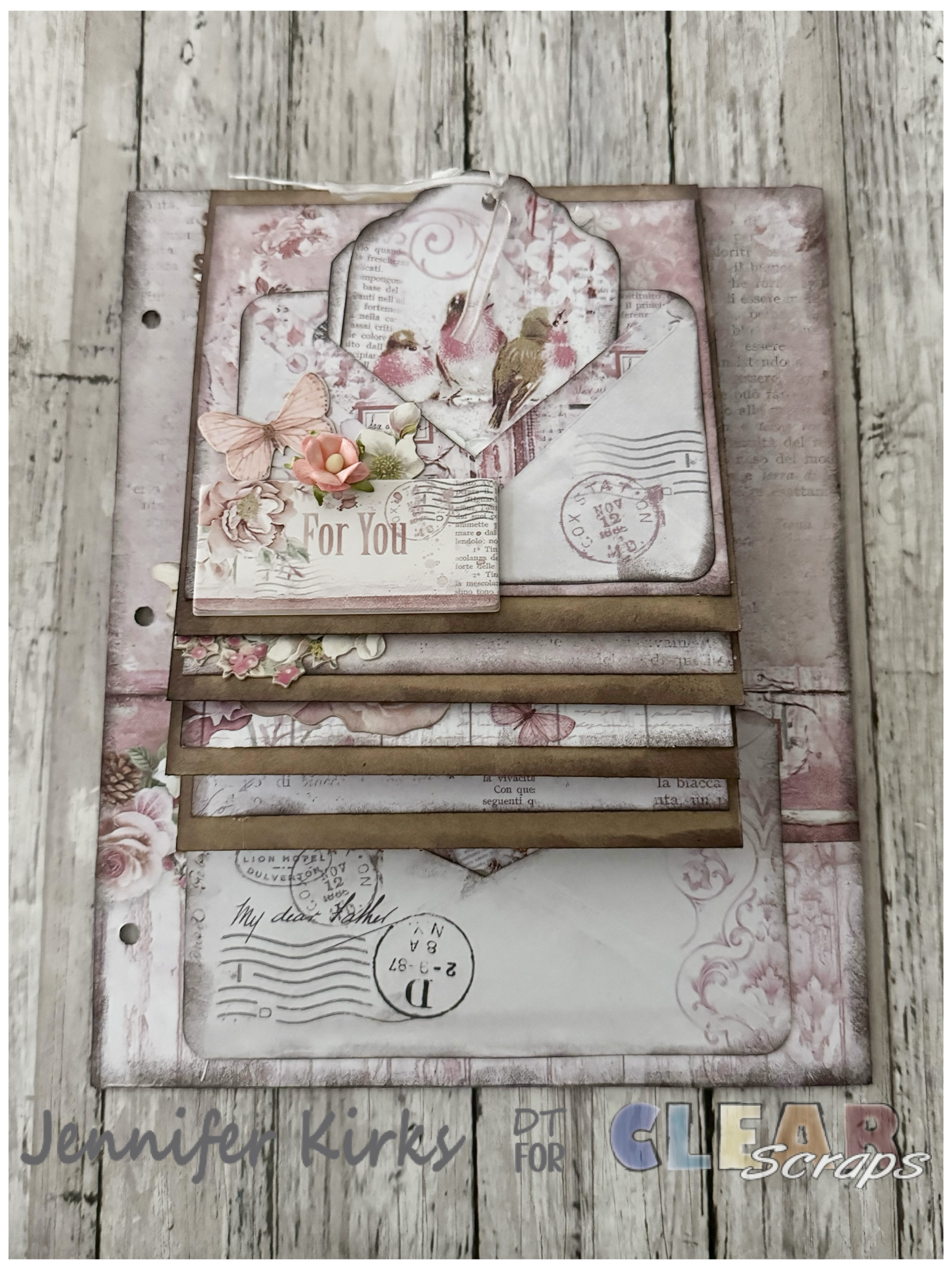 For the final chipboard piece, I aimed to create numerous opportunities for both photos and journaling. I incorporated a waterfall element, ensuring each page provides space for either photos or written memories. As for the base page, I meticulously cut an envelope using an exacto knife and tucked in some journaling or photo cards for added personalization.
