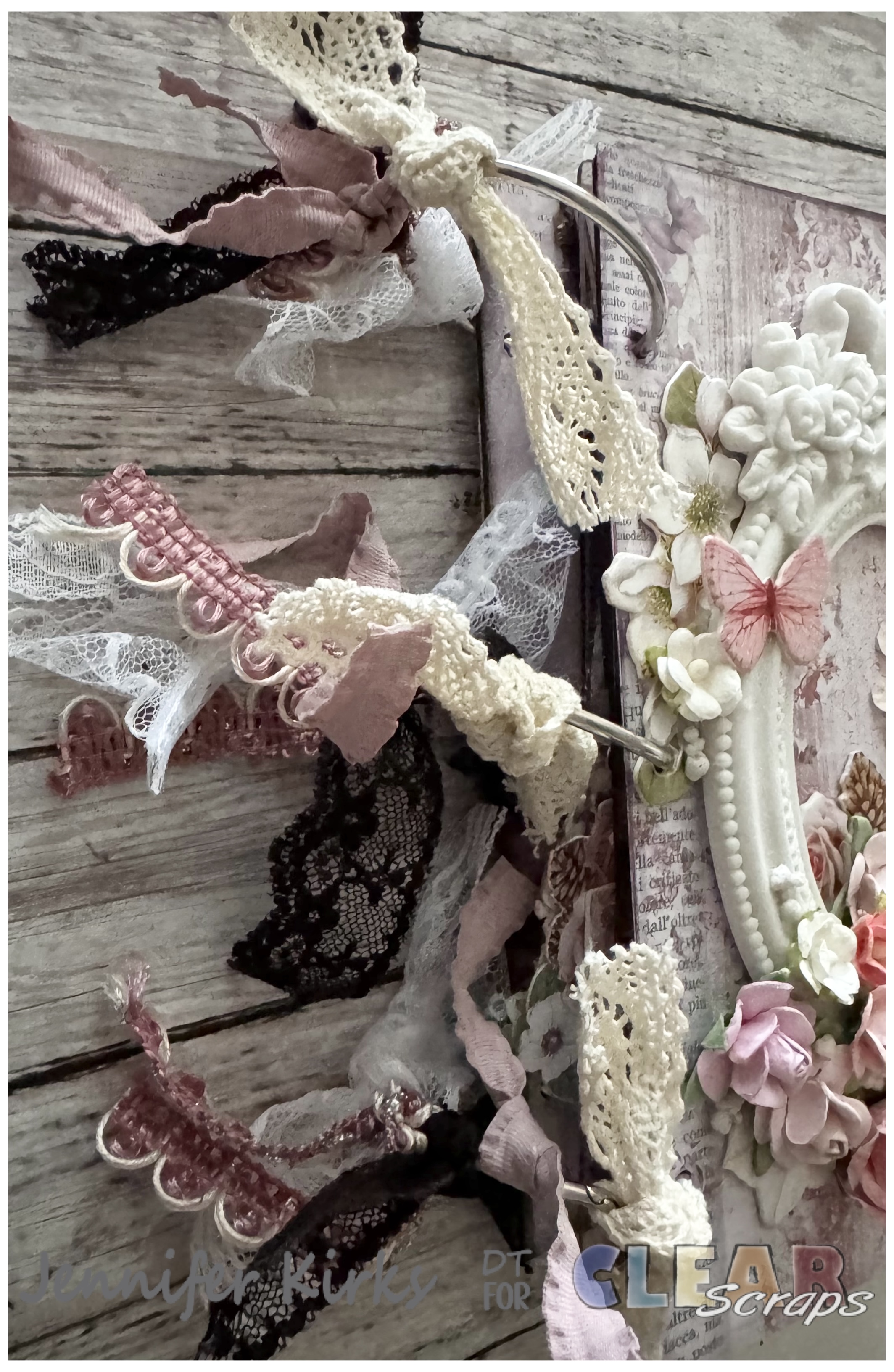 To unify the album, I incorporated book rings and various ribbons and lace to both conceal the rings and infuse charm throughout the design. This final touch not only brings all the elements together but also adds a delightful aesthetic to the album, completing the look with a touch of elegance. Combining acrylic pieces with chipboard offers a versatile way to add depth and personality to your albums. The contrast between the transparency of acrylic and the sturdiness of chipboard creates a dynamic visual effect, enhancing the overall appeal of your creations. It's a fantastic way to elevate your album designs and make them truly unique!