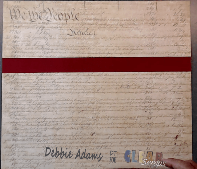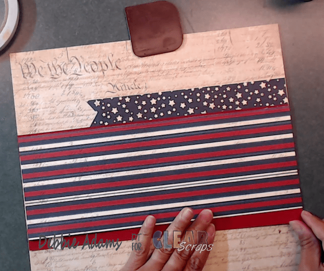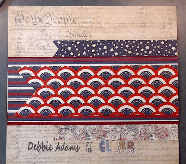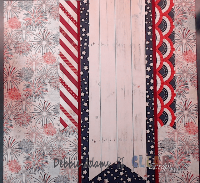 Next adhere the the 4 1/2 x 12 inch piece down and with at least 1/4 inches showing on the top, and place the 2nd 1 x 12 inch red strip down on the bottom, as shown below. Also cut the 1 x 8 3/4 inch strip into a banner (fish tail, see below the blue w/stars) and adhere that right above the red strip.