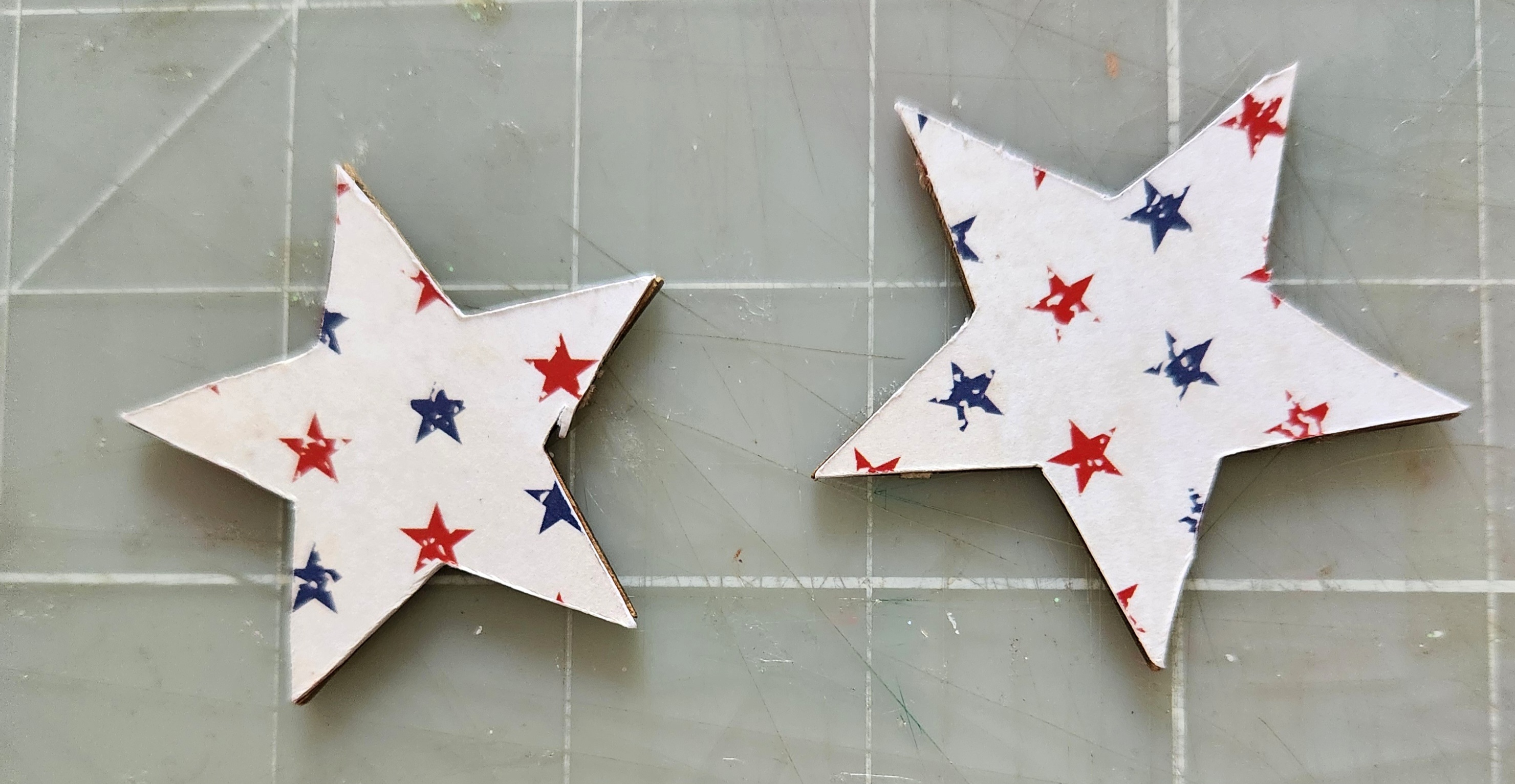 The other two chipboard stars, I covered them with tiny star patterned paper and trimmed away any excess paper from each star. Then used my sanding tool to smooth any rough edges. See photo: