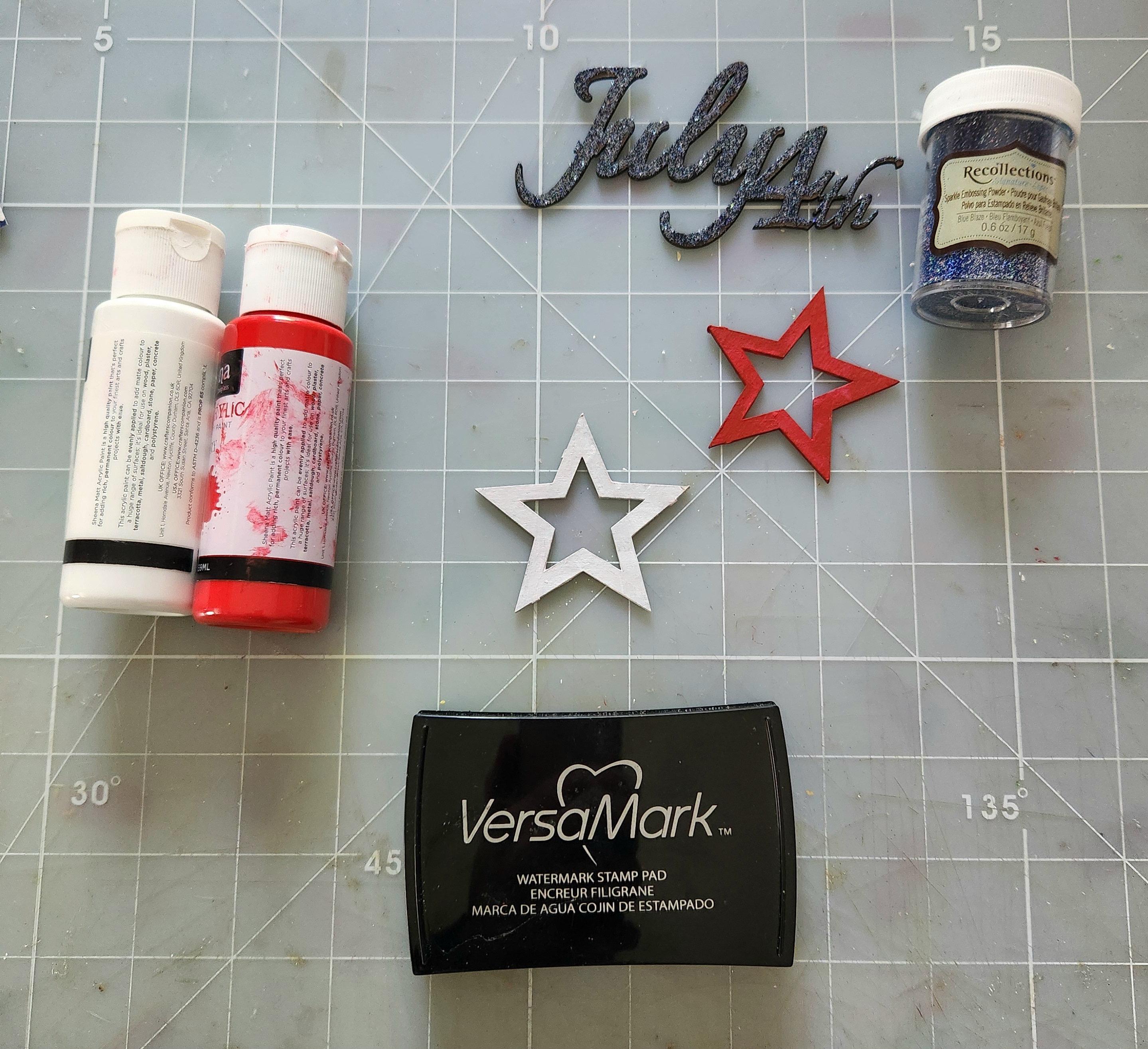 Set album aside for now. Cut apart your chipboard stars from the frame. (I like to save the outside frame for future projects) Take some red and white acrylic paints and apply to both cutout star chipboard pieces. Make sure to the the sides and inside points. Set aside to dry. The July 4th chipboard word title below: