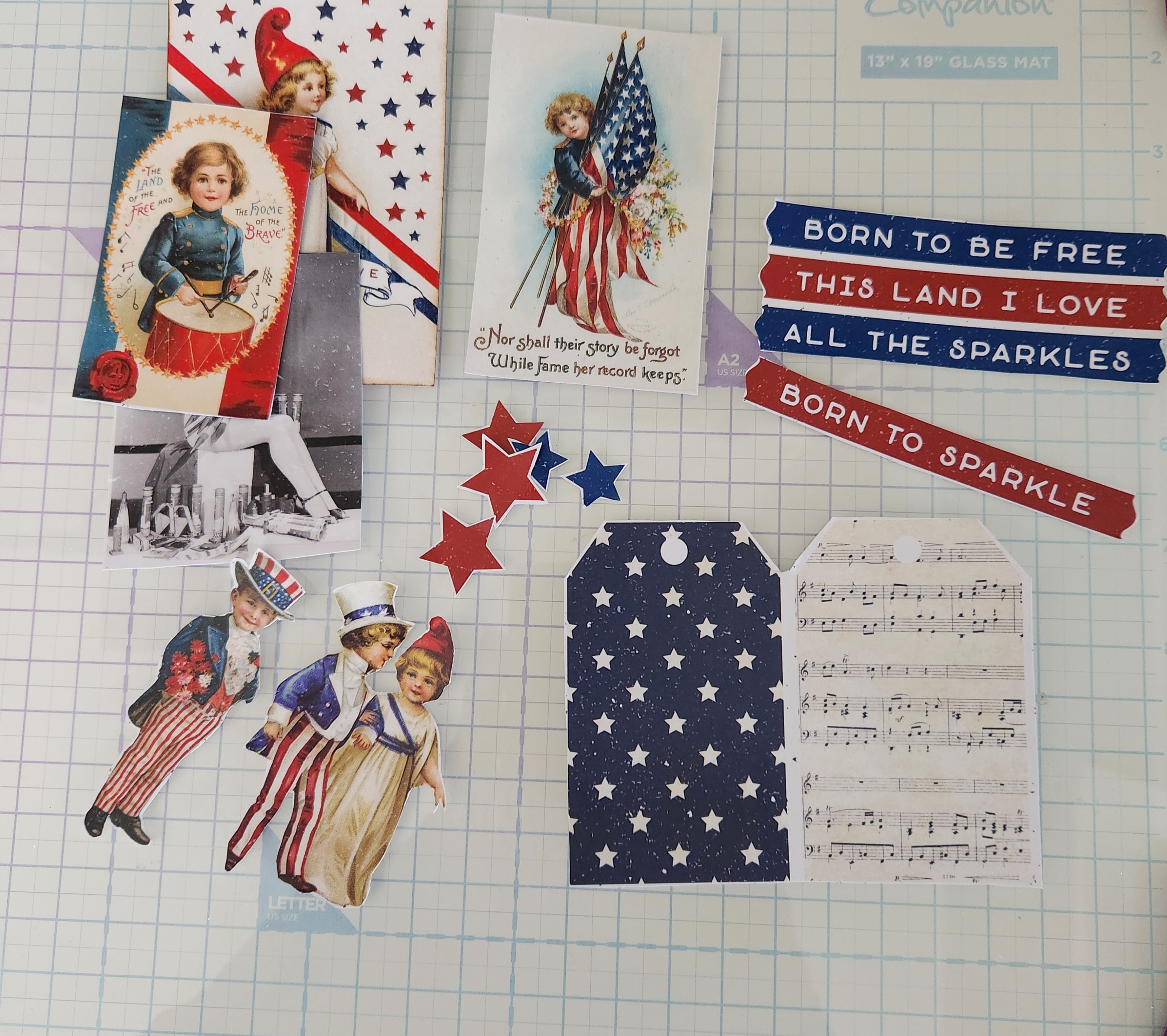 Set the stars aaside.Next I fussycut several images, sentiments and tags from my element sheets and some journal cards. We may not use all of them but you can save for future projects.