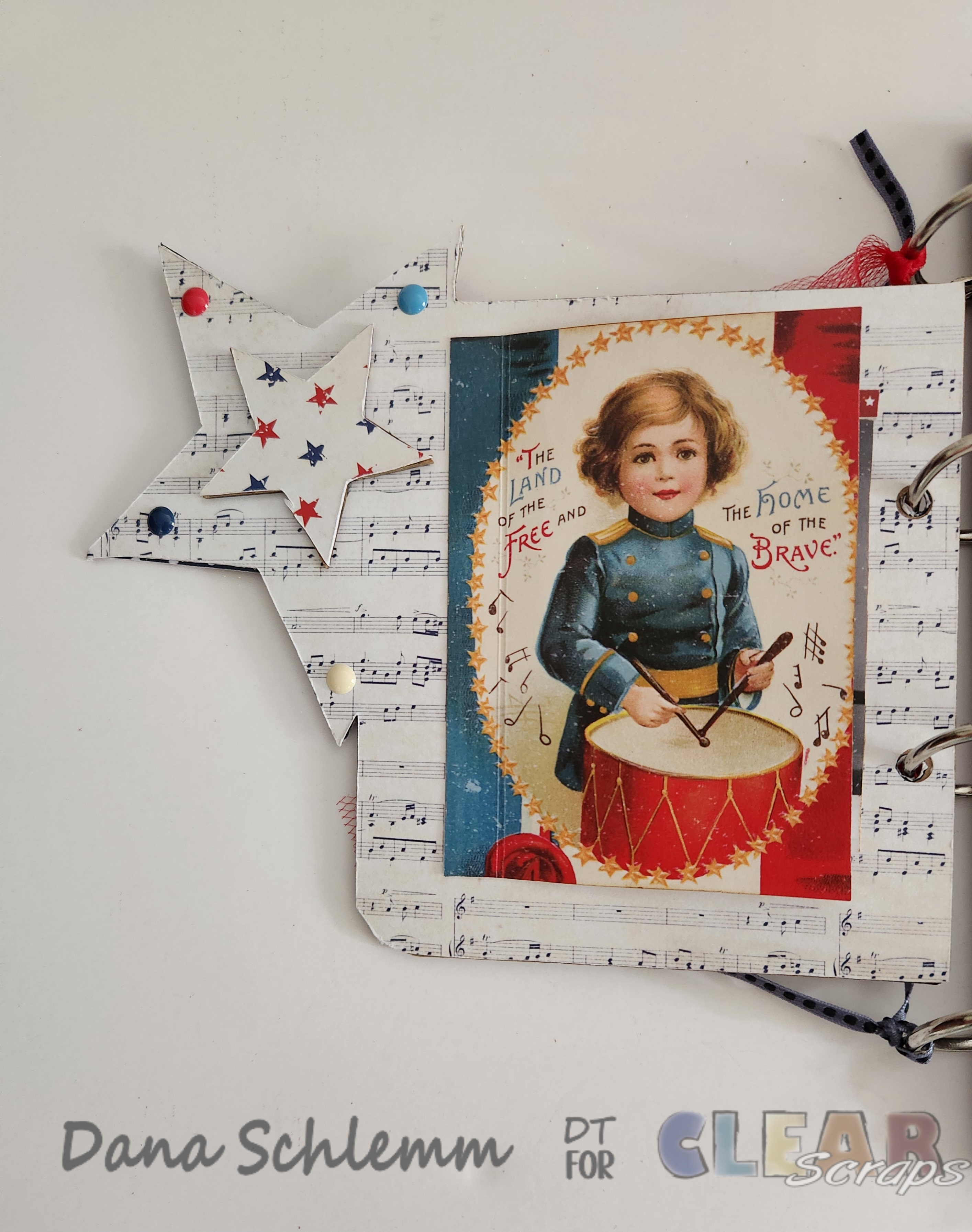Back of front cover: I glued the other multi star chipboard in the center of the star on your page. On each star point, I applied some enamel dots. Then taking another journal card, I score 1/2 inch on the right side and adhered to my page as a flip page. Underneath I glued another journal card with the patriotic lady, a sentiment strip above my photo. On the opposite side, I cut a piece of tiny star paper and glued in place. You could add another photo here if you like. Here's acouple photos:
