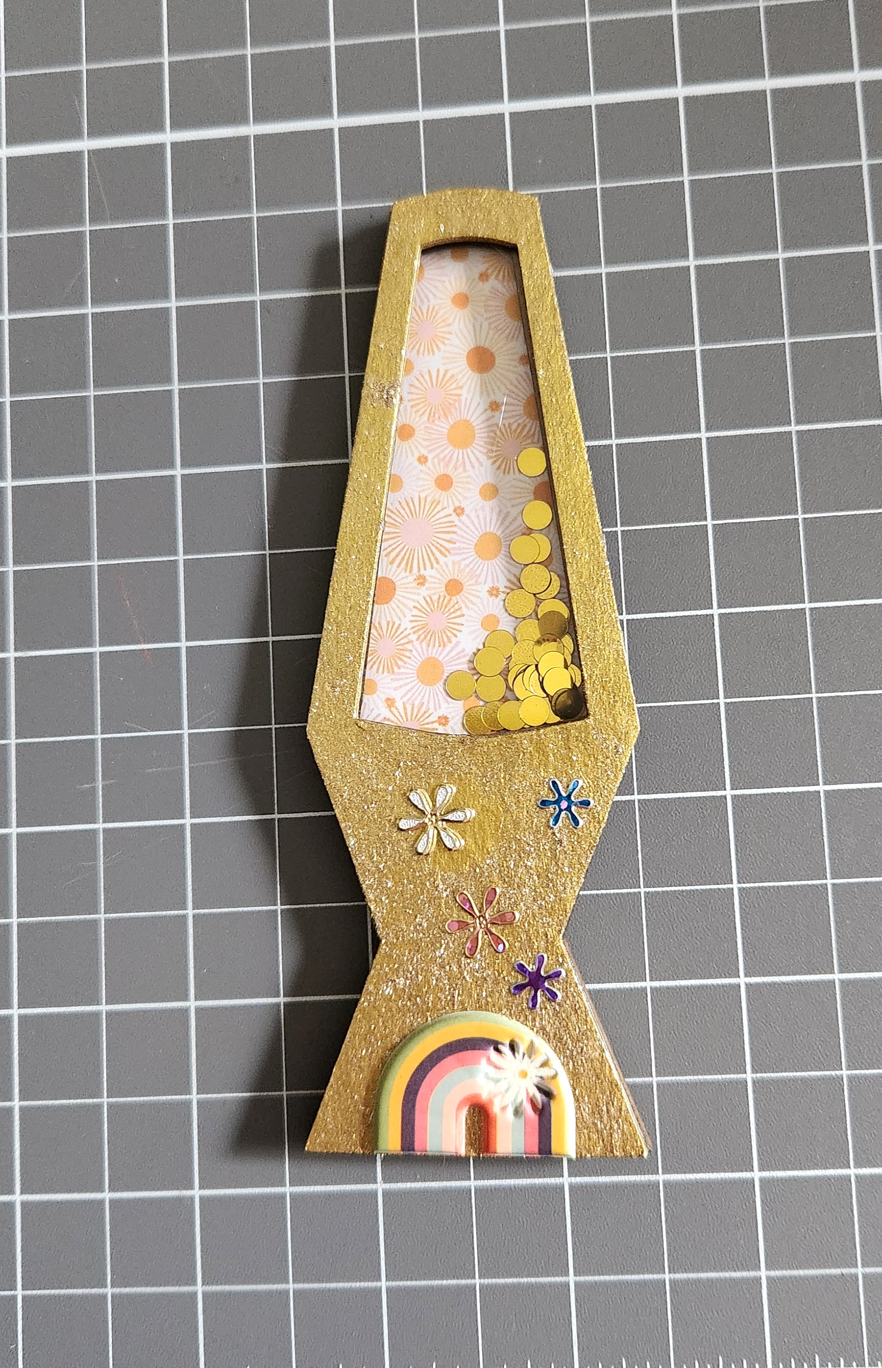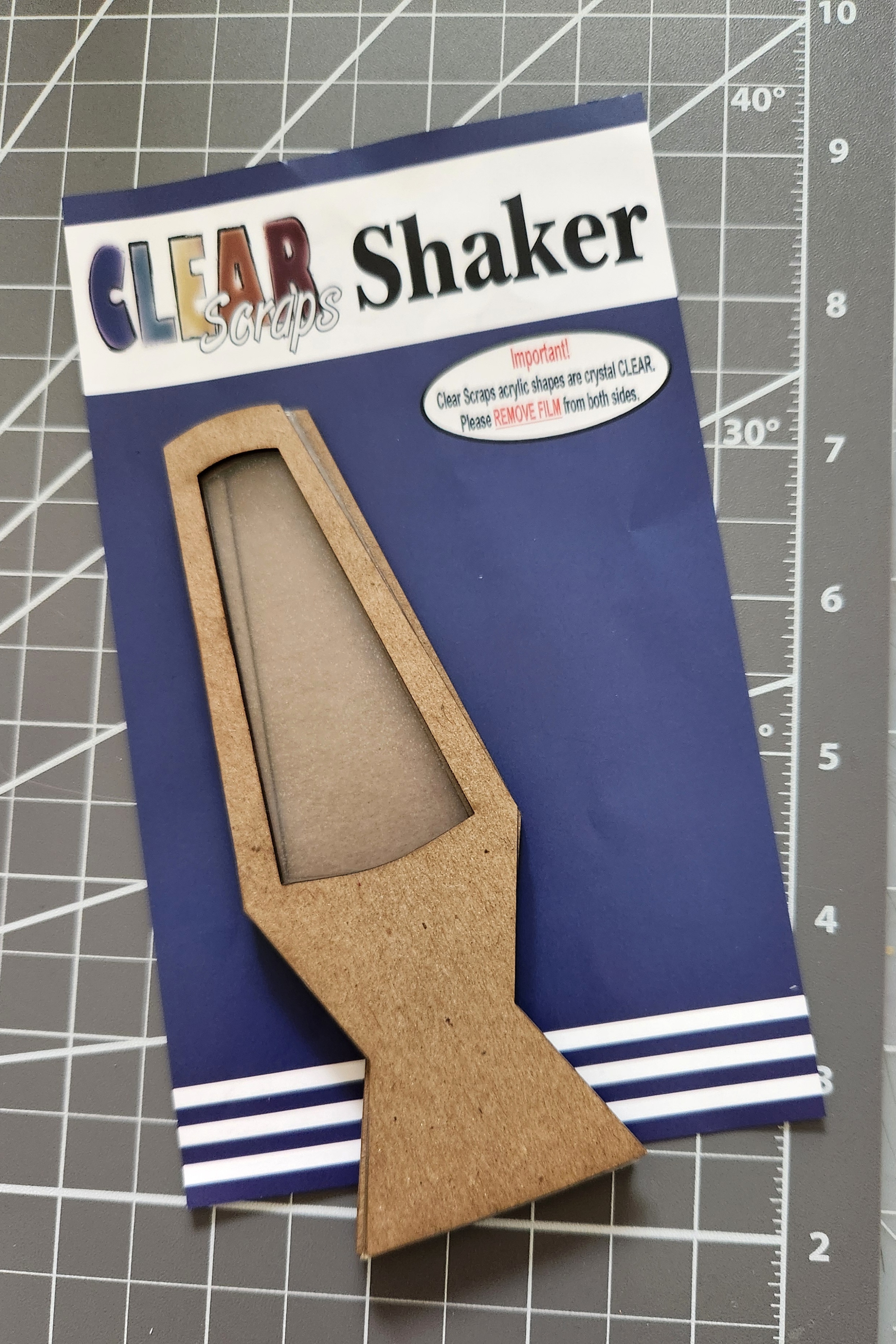 Now glue the two chipboard pieces onto your bottom shaker piece. Fill with the shaker filler of your choice. Clear Scraps has a variety of different shaker fillers Click here Then peel off the protective film from both sides of your acrylic shaker piece before adhering. Add your top shaker piece and set aside until throughly dried before shaking! After your shaker has dried you can decorate as you prefer. I added a puffy rainbow sticker at the bottom and a few Dazzle flower stickers Scattered. See photo: