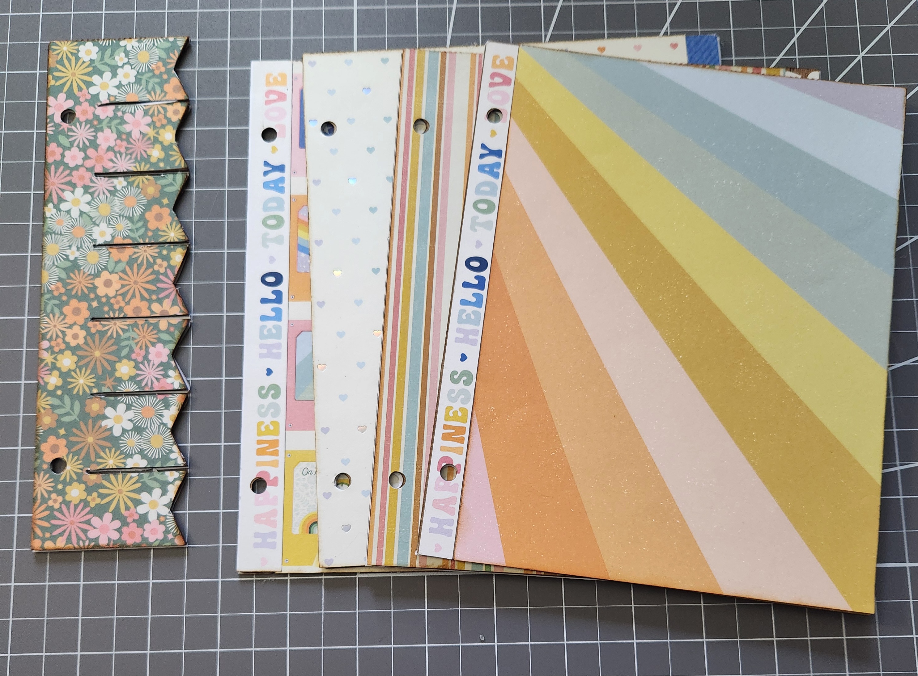 To start our project I chose a variety of patterned papers from the 6 x 8 paper pad to cover both the front and back covers and all inside pages. The chipboard album pages measure 6 & 1/2 inches. I did use different border strips to cover each album page. Trim off any excess paper. I also covered the Banner Chipboard piece on both sides with a floral paper and trimmed away any excess paper using my x-acto knife. Cut between each slit on your Banner. Mark and punch all holes before adhering your papers in place. See photo: