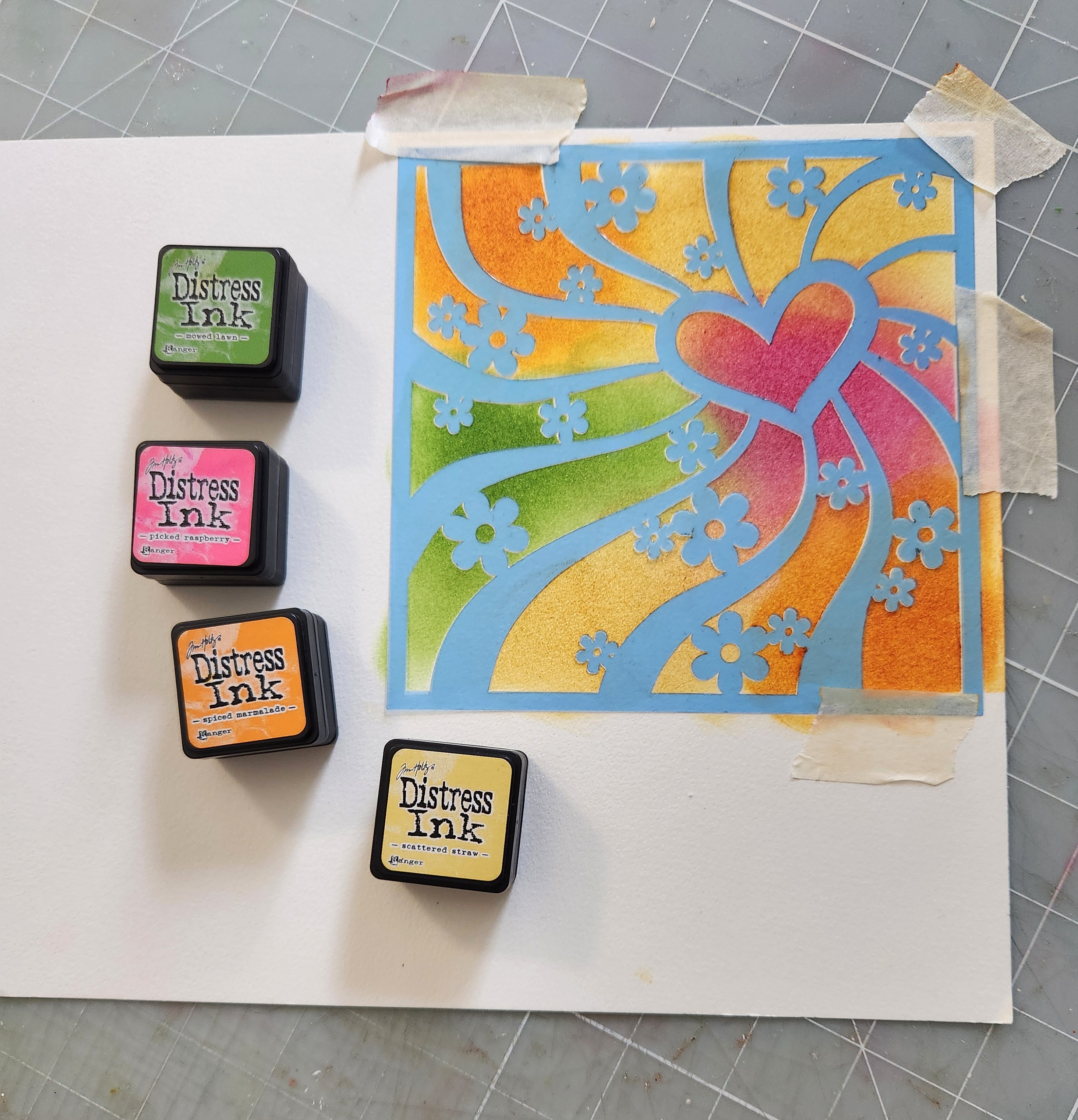 Set your album aside for now. Remove your Stencil from your package. Using masking tape, I securely taped my Stencil onto a piece of watercolor paper. You don't want your Stencil to move while applying your ink. I chose some Tim Holtz Distress Inks Mowed Lawn, Pickled Raspberry, Scattered Straw and Spiced Marmalade. Using an ink dabber I applied each ink using a circular motion. Here's a closeup look: