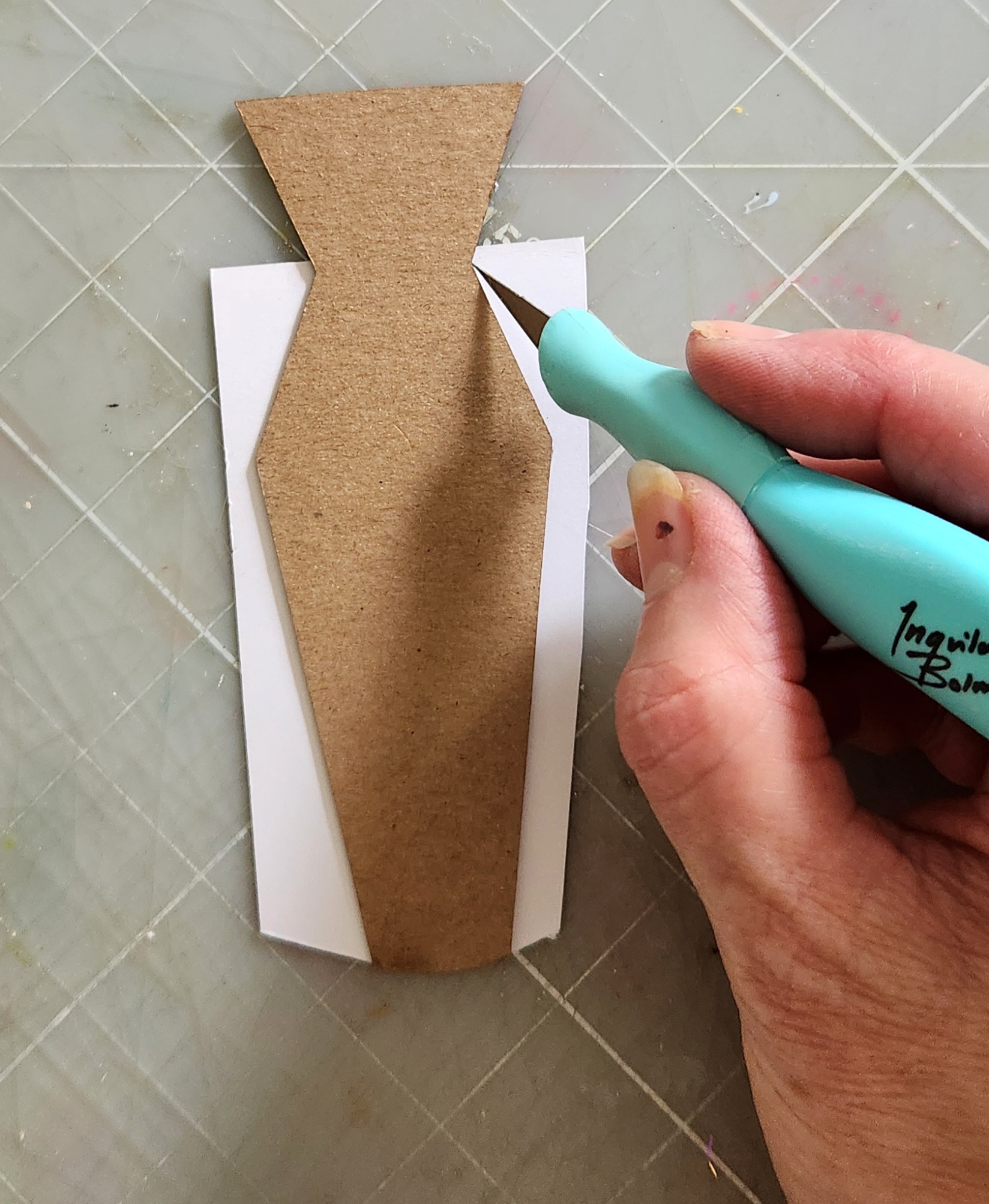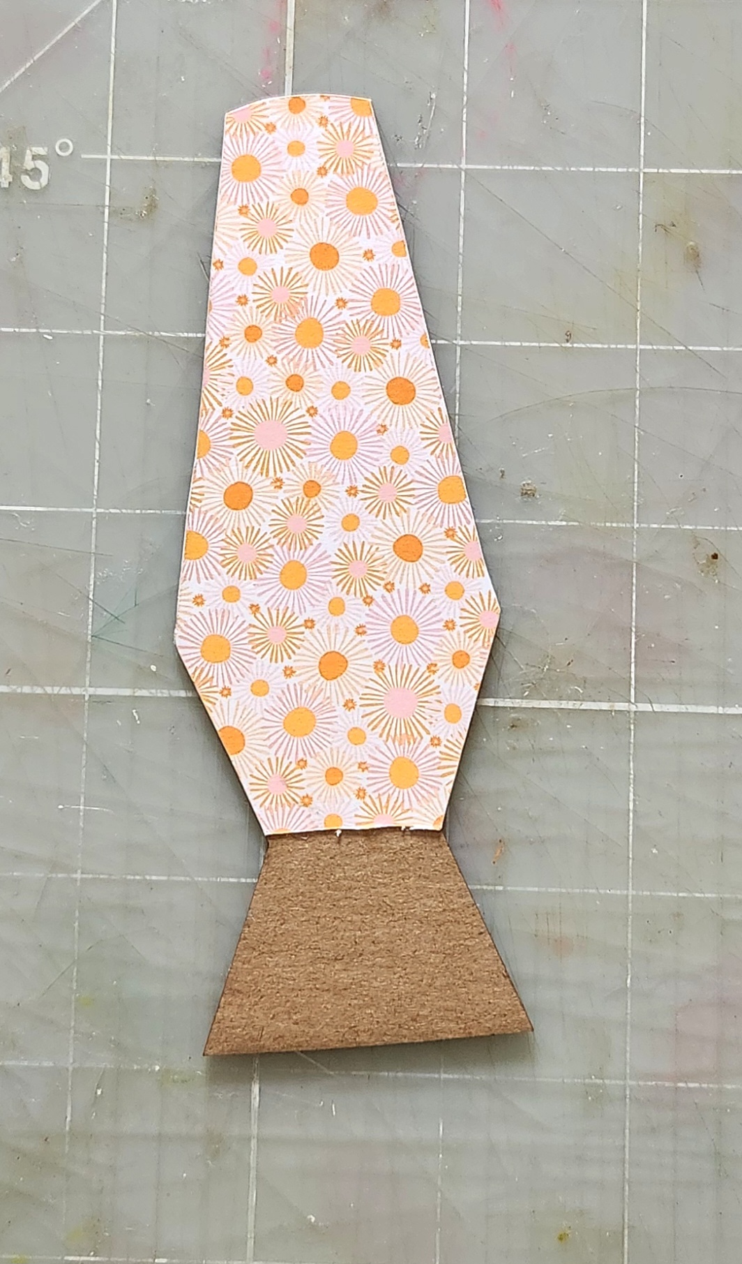 Page 3: set aside your album and your Mini Shaker Lava Lamp piece. We will be decorating and assembling our shaker. Take the bottom shaker piece and cover with patterned paper. I chose this orange dotted/Starburst paper since I thought it resembles the inside liquid in a Lava Lamp. Using my xaco knife I trimmed away any excess paper. For the top shaker piece,