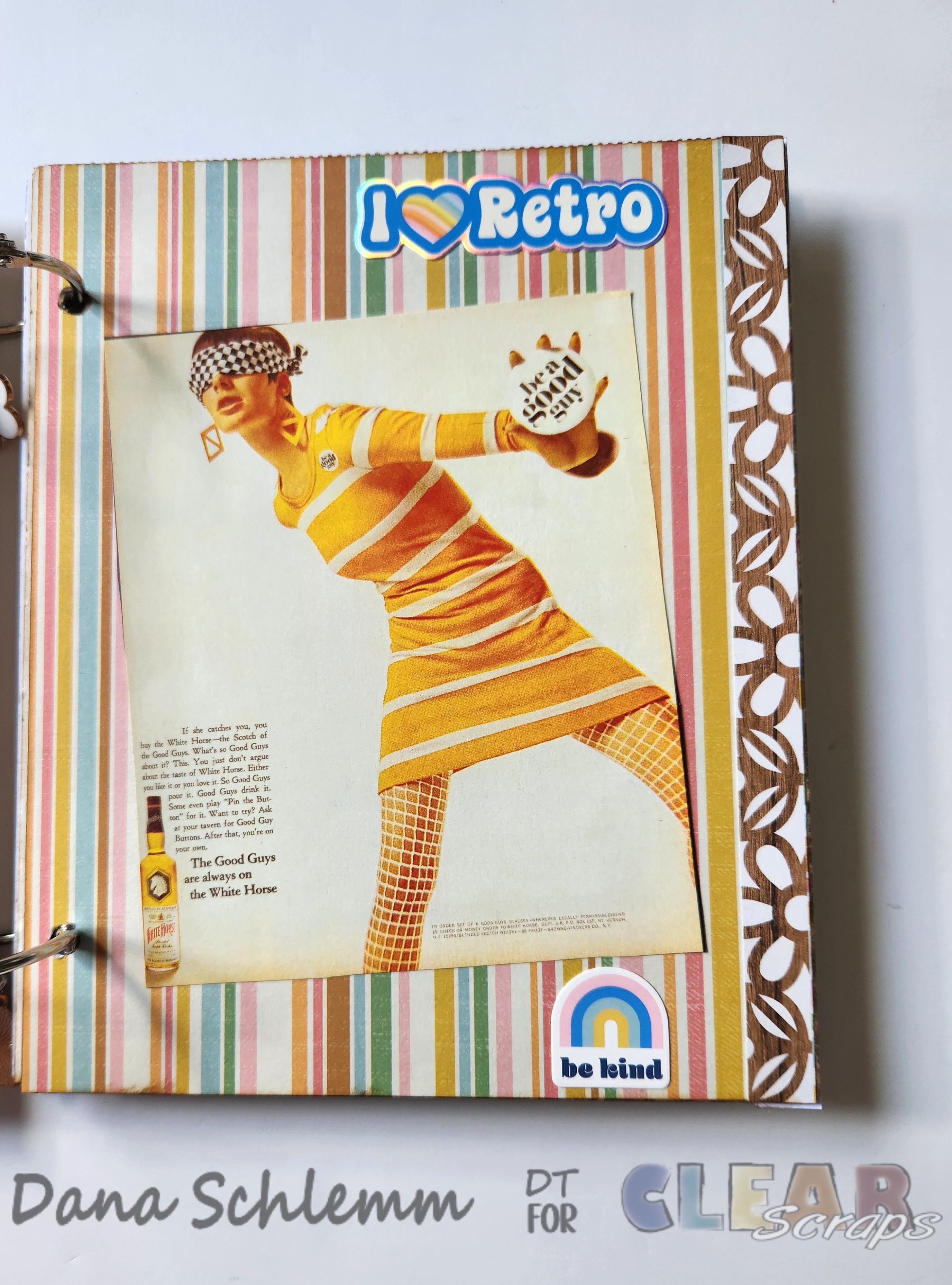 Page 2: I cut out this Groovy gal from a magazine Advertisement and glued at a slight angle across my page. I applied acouple stickers. Here's my finished pages: