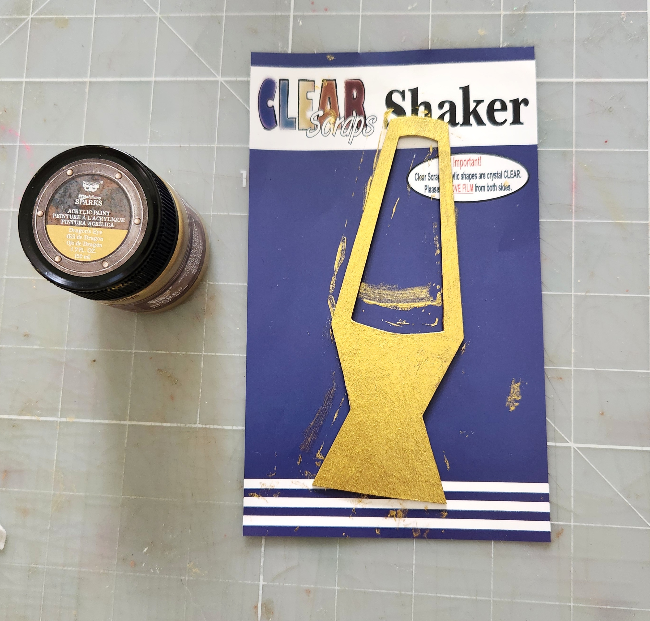 I applied some Finnibair Dragons Eye acrylic paint to the front and sides of all my shaker pieces except the acrylic piece. Let dry.