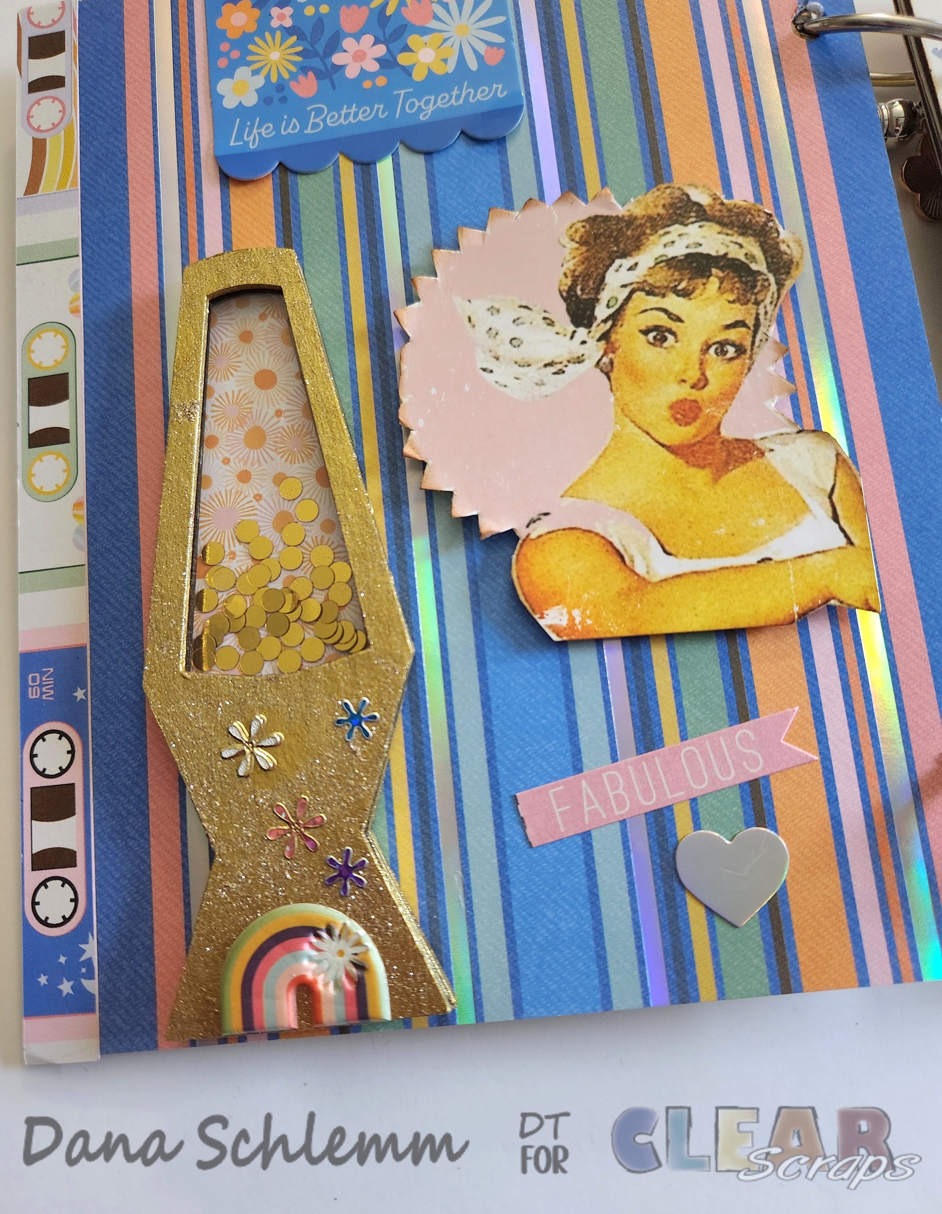 Now we can decorate page 3: I glued my Lava Lamp shaker onto the left side of my page. I cut out this vintage gal from a journal card and applied foam dots onto the back and adhered on the right side of my page. I added a few stickers. Here's a closeup look: