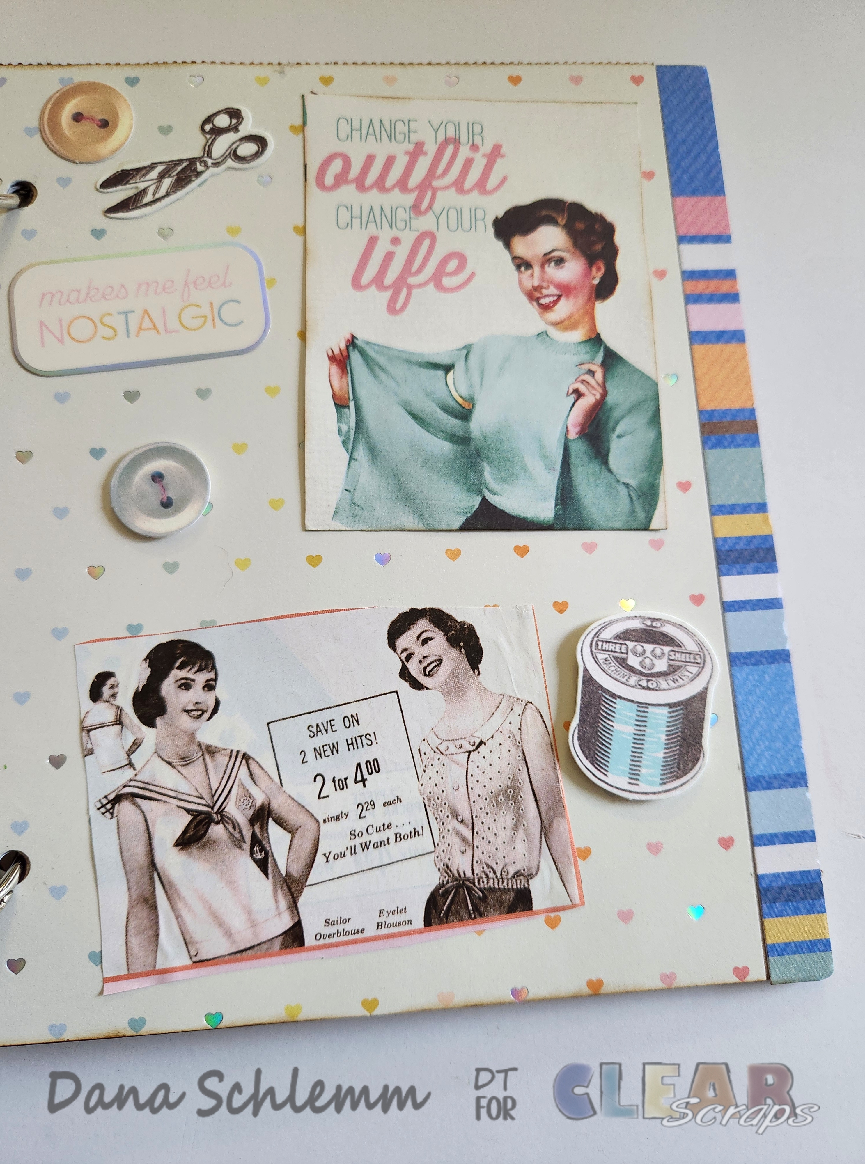 Page 4: I glued a journal card on the upper right corner. And cut out a old sewing advertisement and glued towards the bottom edge. I added a sticker sentiment and a few sewing ephemera pieces, some with foam dots to add dimension. Here's acouple photos: