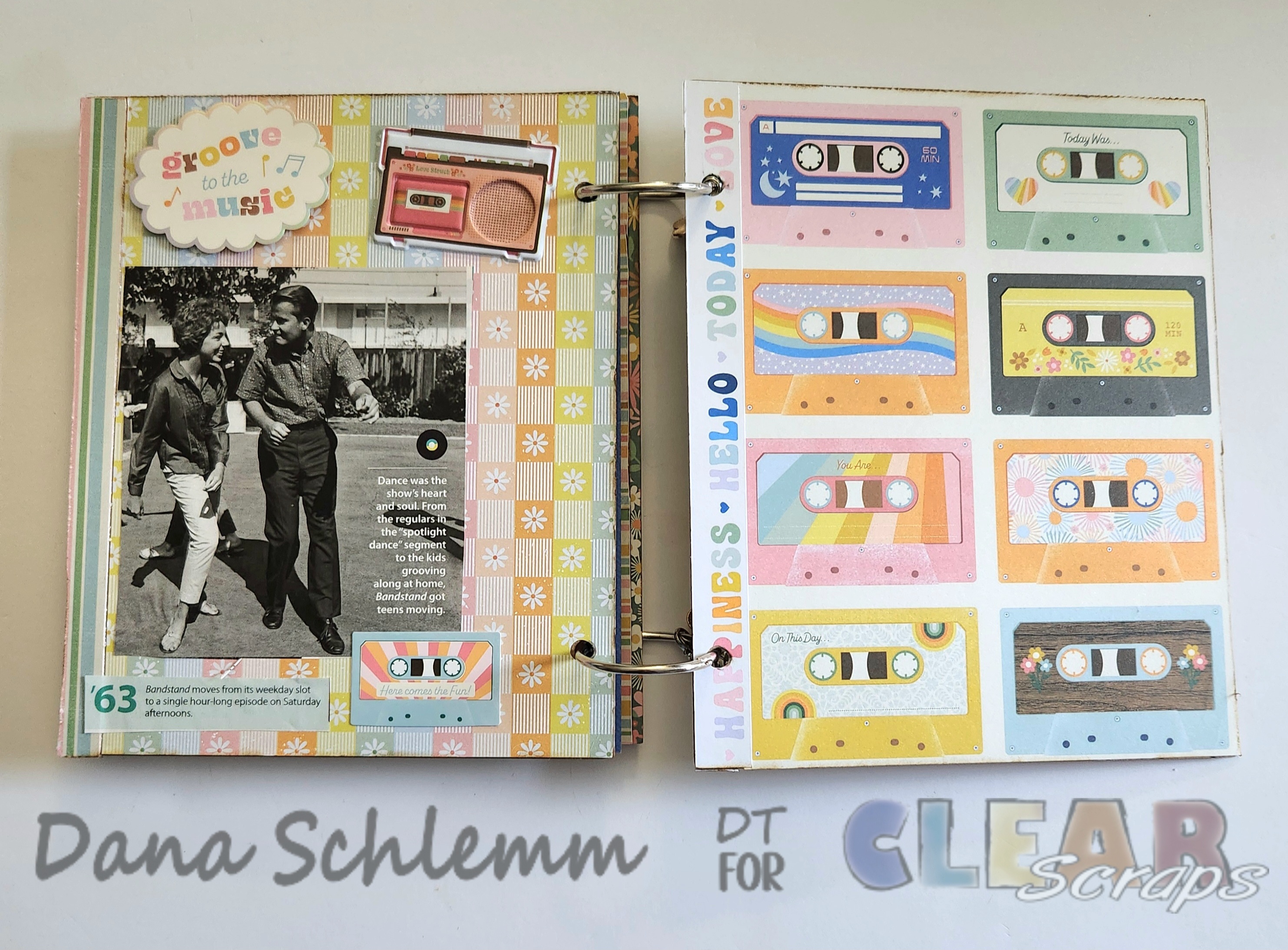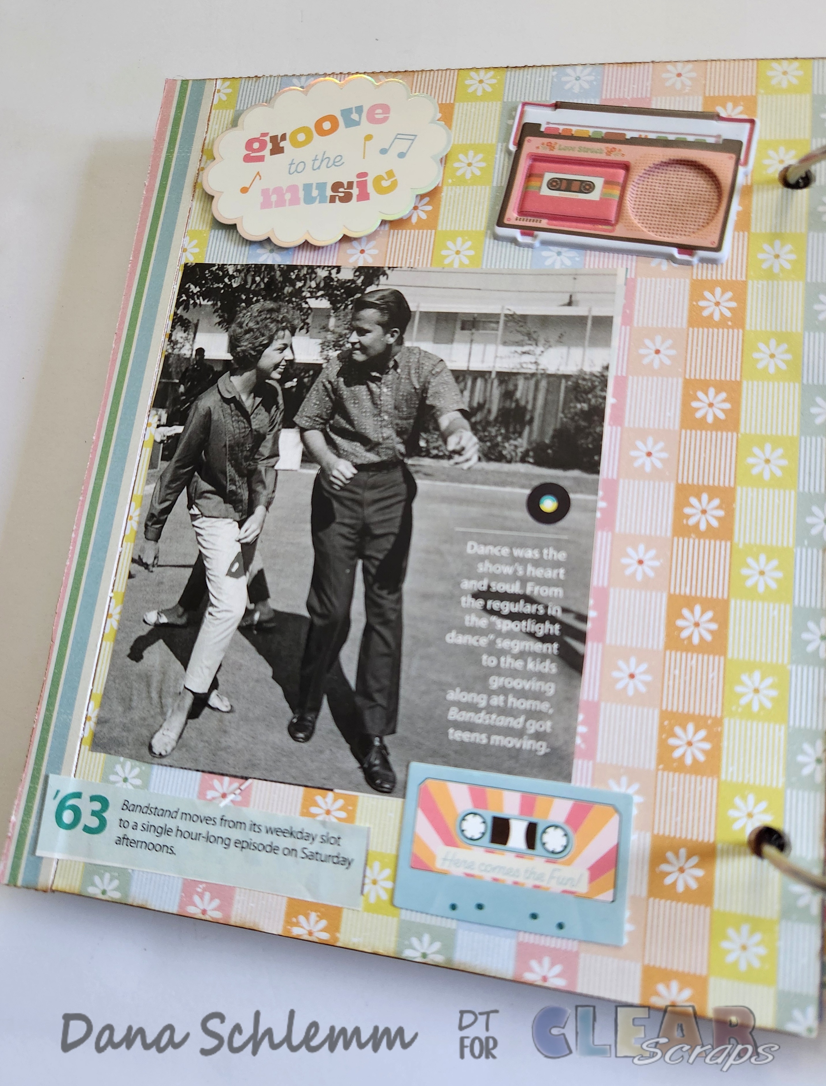 Page 5: I glued another magazine photo of Dick Clark on American Bandstand back in the 1960's. I applied a sticker at the top using foam dots to add dimension. I applied a puffy sticker Boom box and cassette sticker at the bottom. I also glued a caption below my photo. Here's a photo: