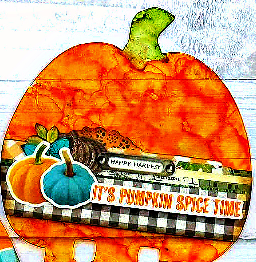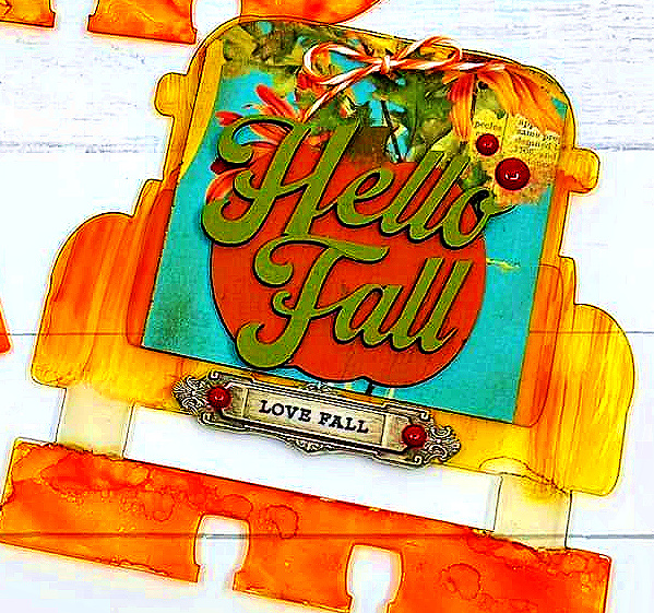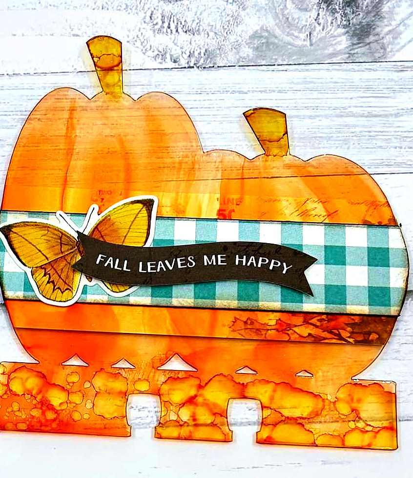 These are really fun to play with! I used alcohol ink–the bottom and stem were pounced on with a felt applicator, and the pumpkins I brushed it on to give the pumpkin texture/look.