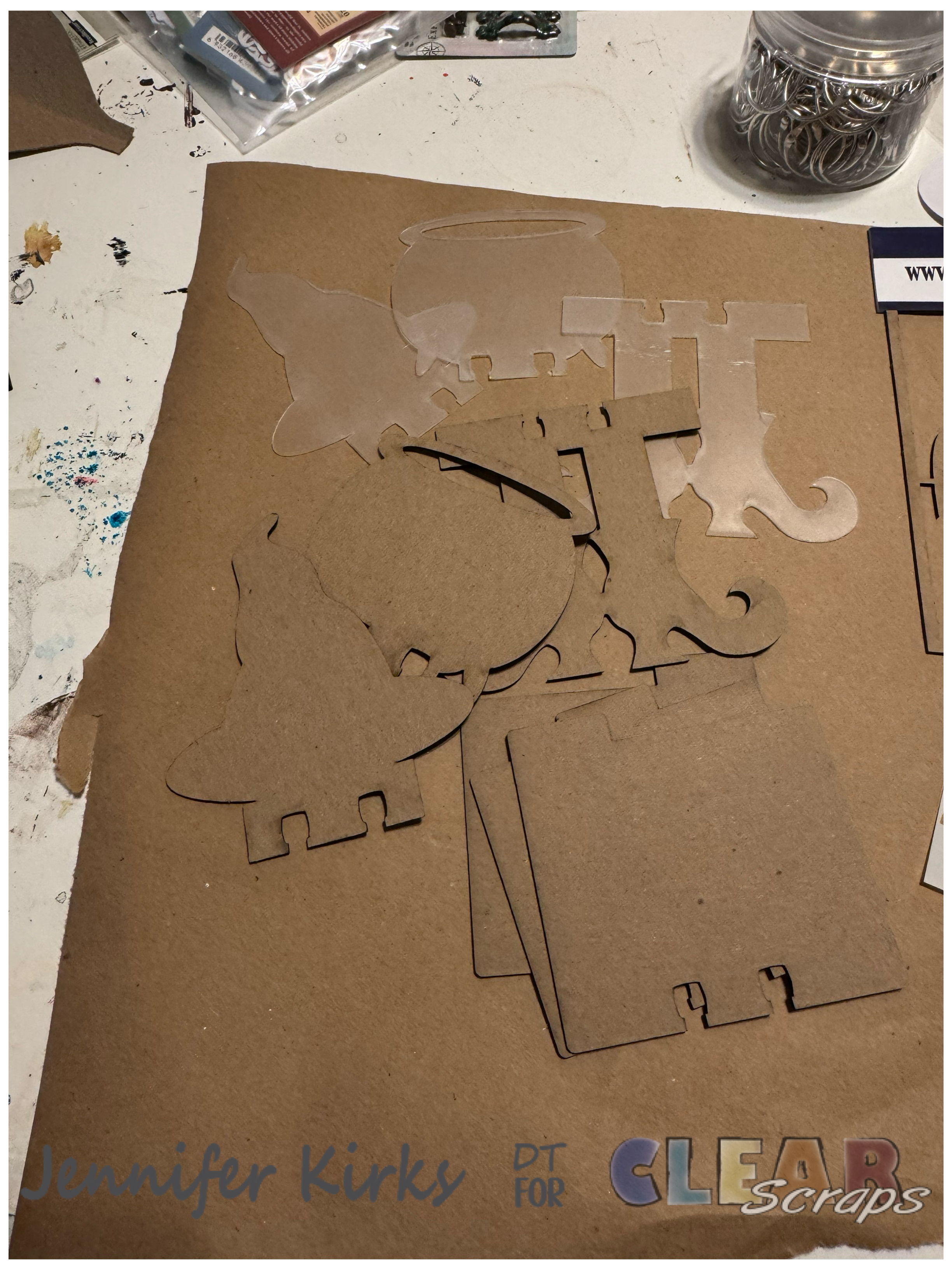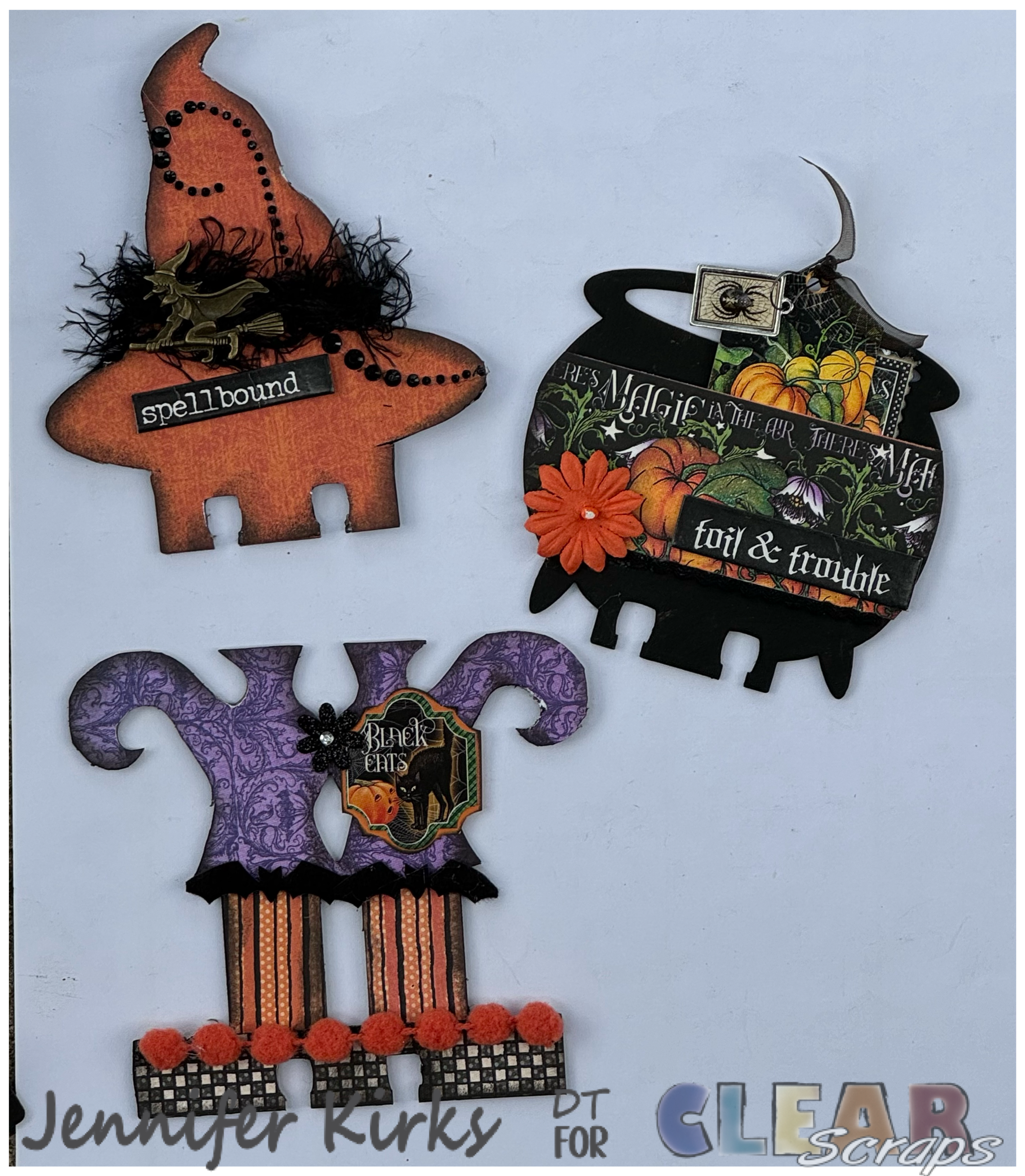 The first set consists of chipboard dividers. For the witches' legs and hat, I meticulously selected the perfect paper, tracing and cutting it with precision using an X-Acto knife to achieve clean edges and intricate details. The final touch included embellishments of ribbon, a charming charm, and a carefully chosen sticker.