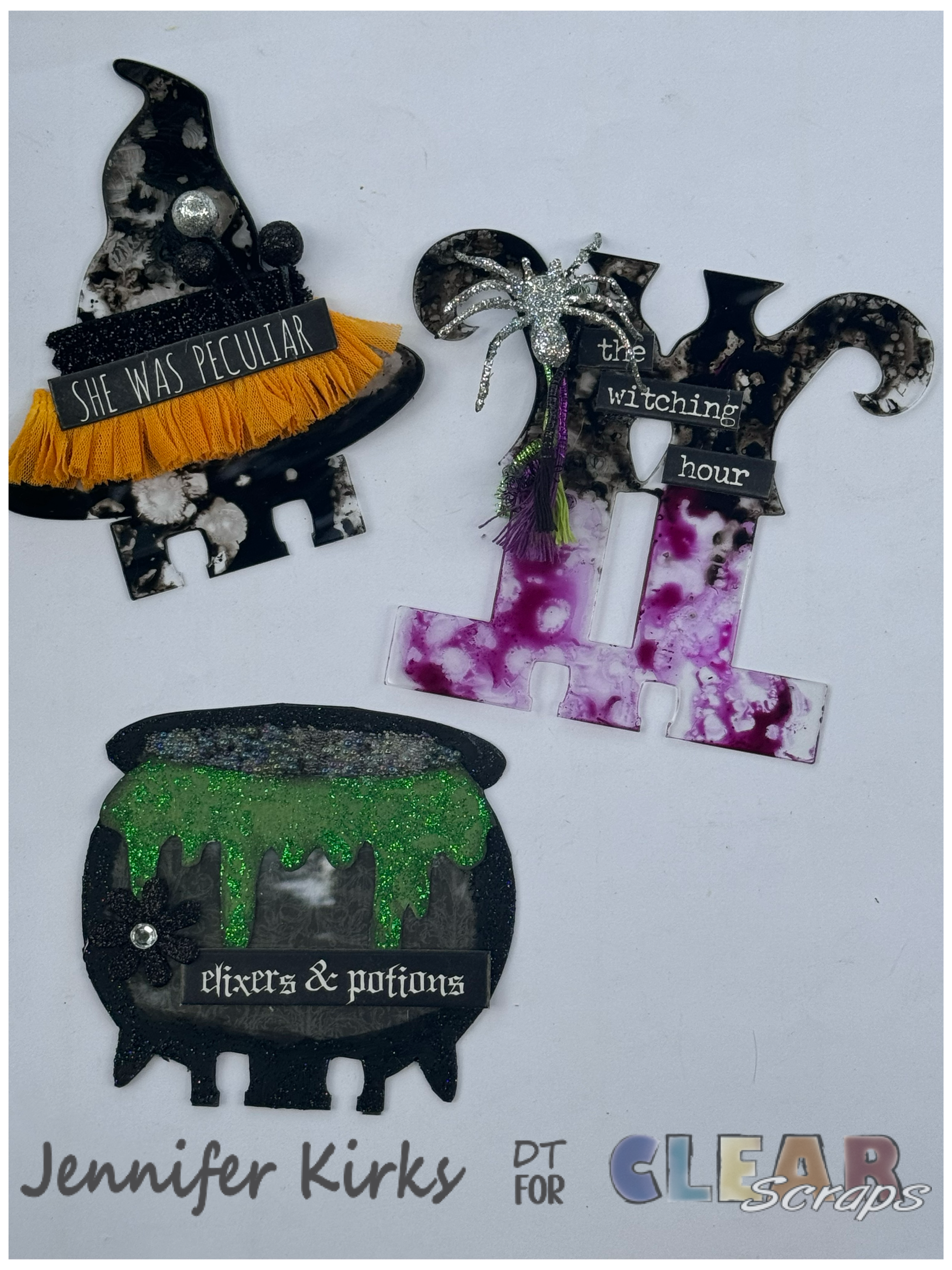 To achieve the playful ribbon effect on the witches' legs, I carefully unraveled strands from green, purple, and orange ribbons, creating adorable curly accents.