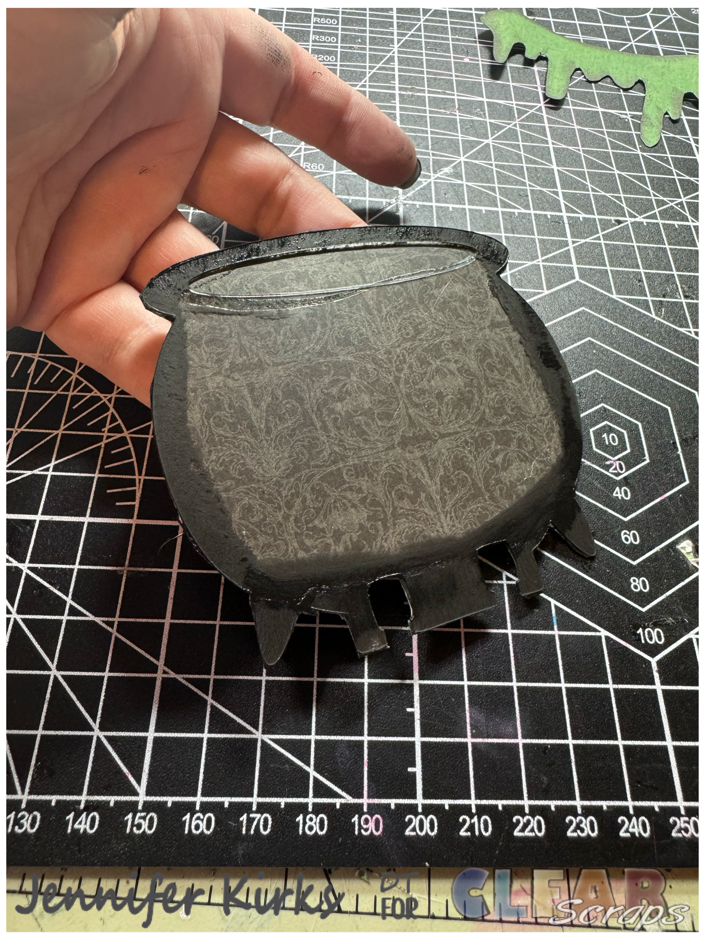 Moving on to the cauldron, I transformed it with bold strokes of black chalk paint. From scraps of paper, I fashioned a quaint pocket, delicately adding a tag adorned with an enchanting charm.
