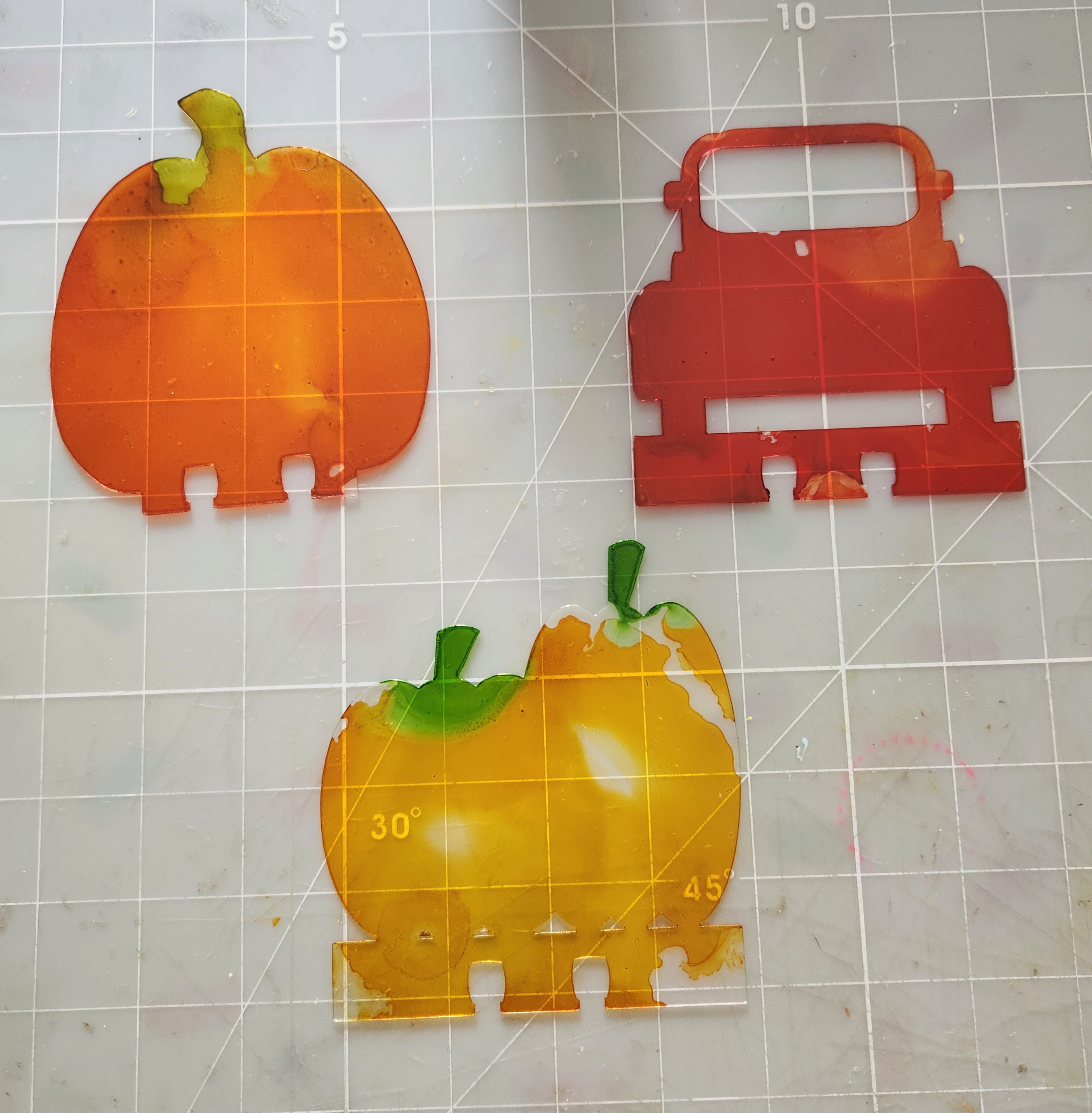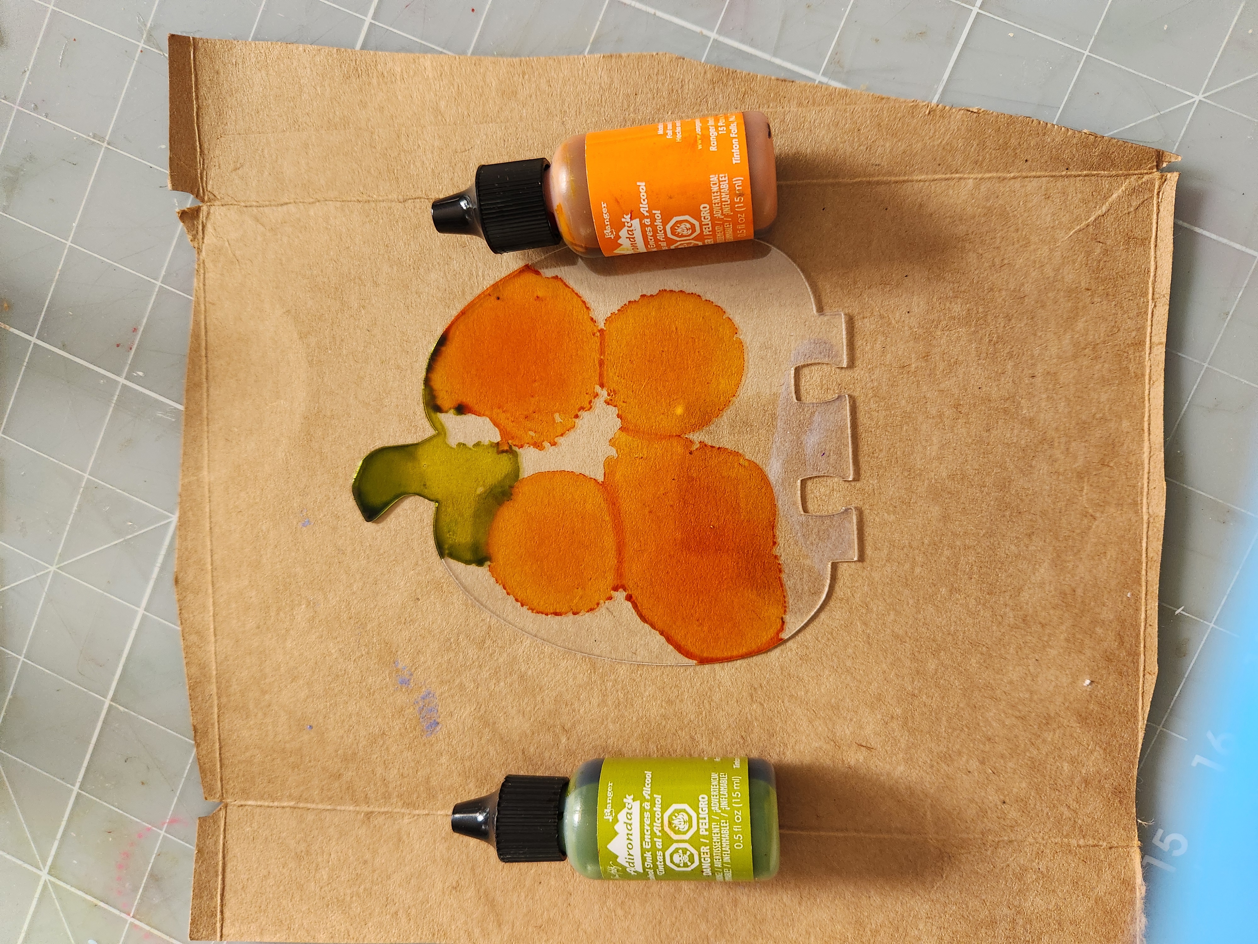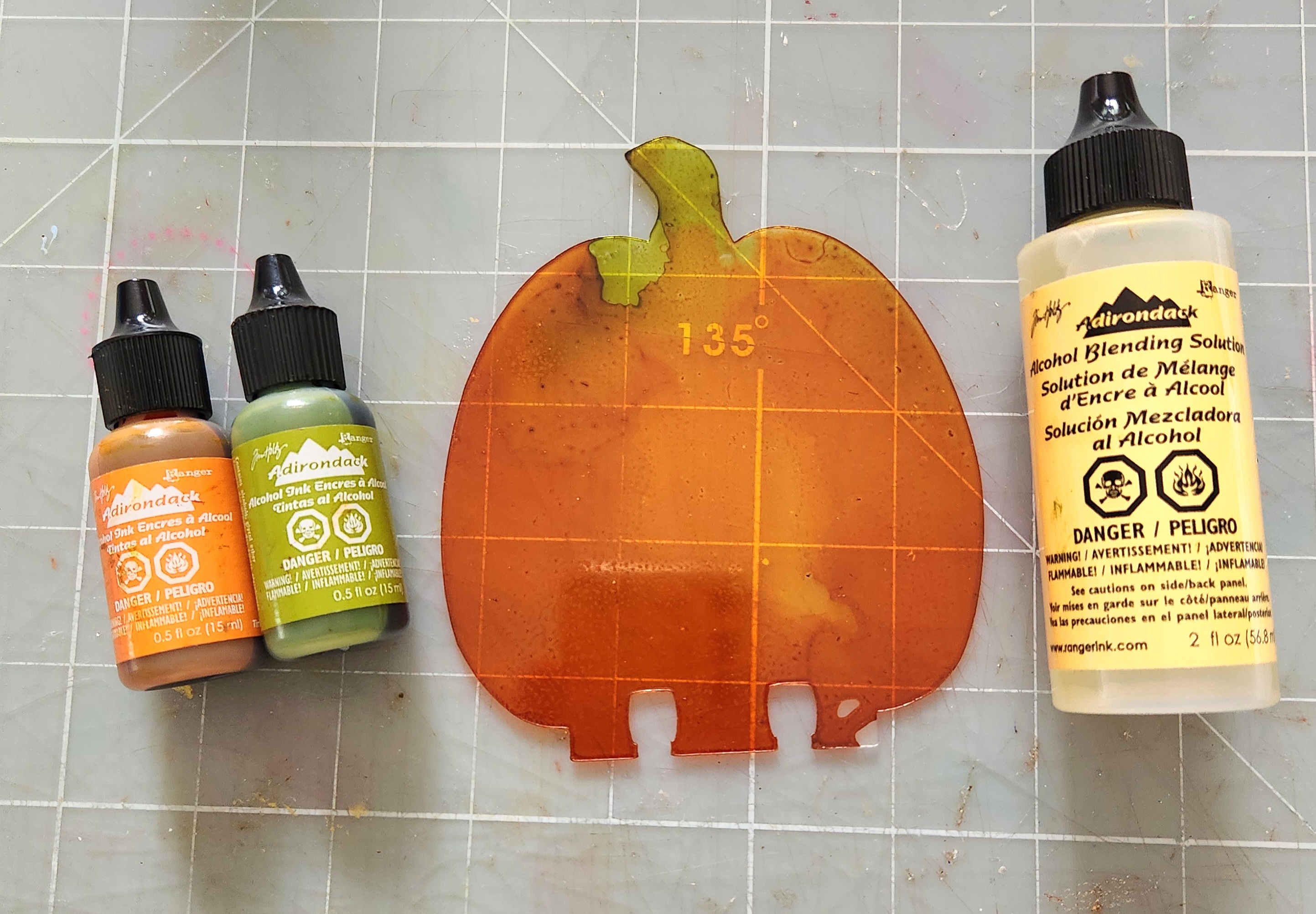 I applied dark green alcohol ink to the stem of my pumpkin. I let some of the ink drip down. This creates a neat effect. Next I'll add a few drops of the orange alcohol ink onto my pumpkin shape. Add a drop or two of the blending solution and let it drip and Swirl around. See photos: