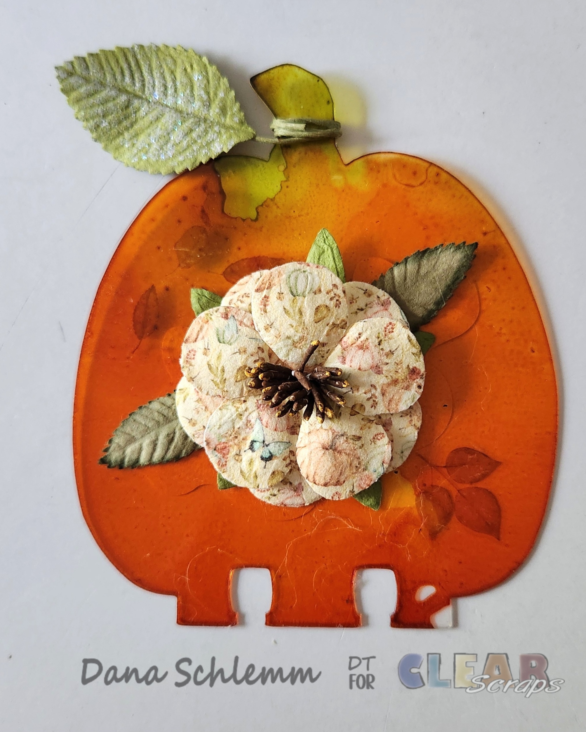 Large Pumpkin: I twisted a green stem and leaf around the stem of my pumpkin. I glued a Prima flower and some leaves on one side. Here's a photo: