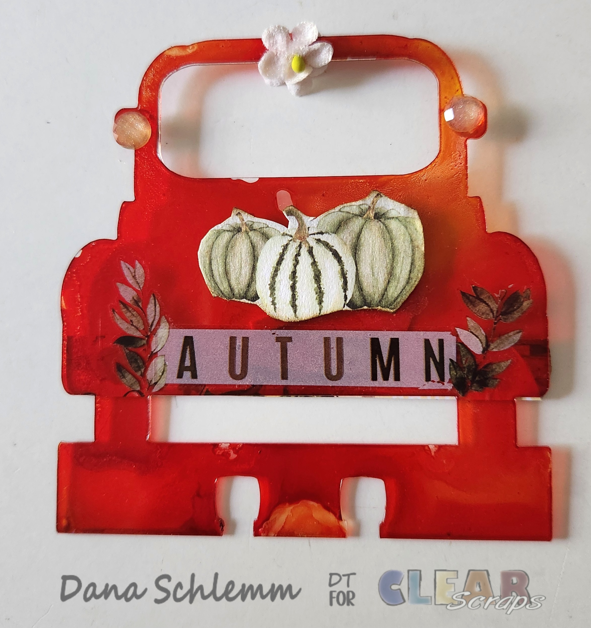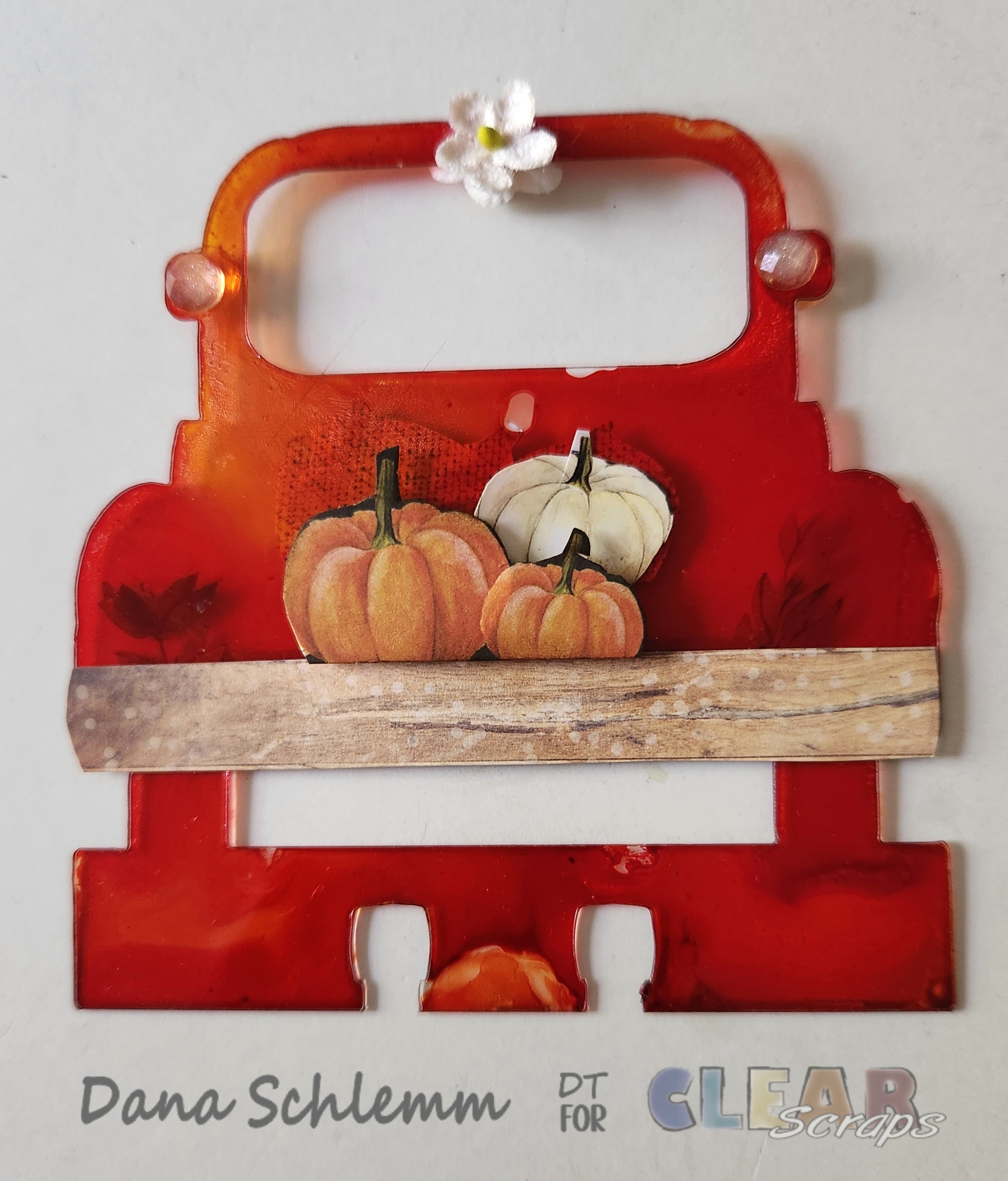 Backside of truck: I applied some Rub-on leaves and "Autumn " sentiment across the bottom edge. I fussycut some green pumpkins and glued above. Then glued another tiny Prima flower at the top! Here's a closeup!