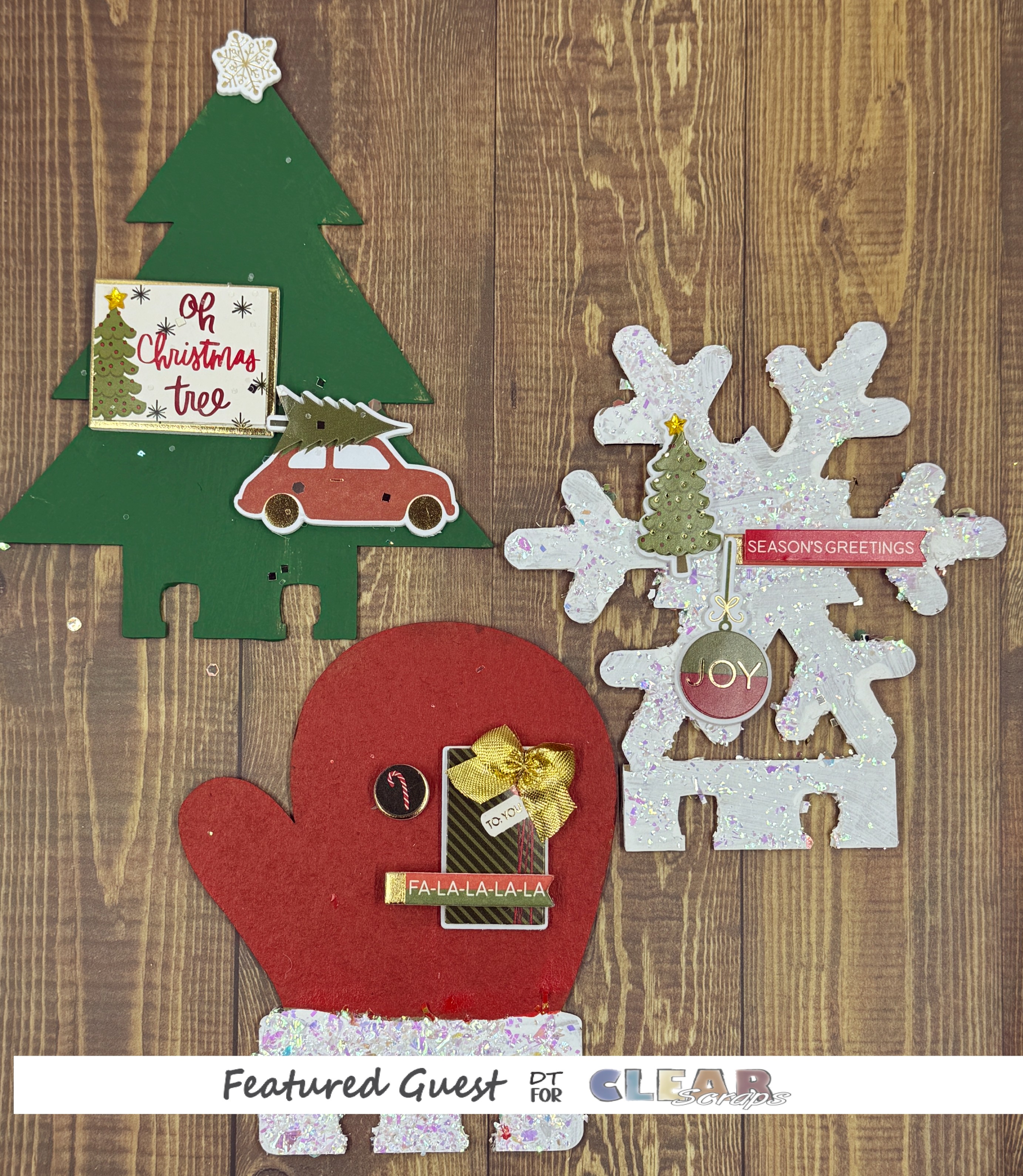Greetings! Chris here and today I am sharing two memory-dex dividers I created for my sleigh memory-dex that I shared a few day ago. The festive sleigh needed some extra special and festive dividers to show off m memories. My first set features the acrylic dividers. I love the dimension you can achieve creating with the acrylic dividers. I chose to adhere two sided Christmas papers to the mitten and tree dividers. I adhered the papers to the "back' side and then added golden gems and a wooden star to the tree and red gem trims and a wooden tree and a festive sentiment to the mitten. For the snowflake I choose to adhere strands of pearls and gems to highlight the snowflake shape.