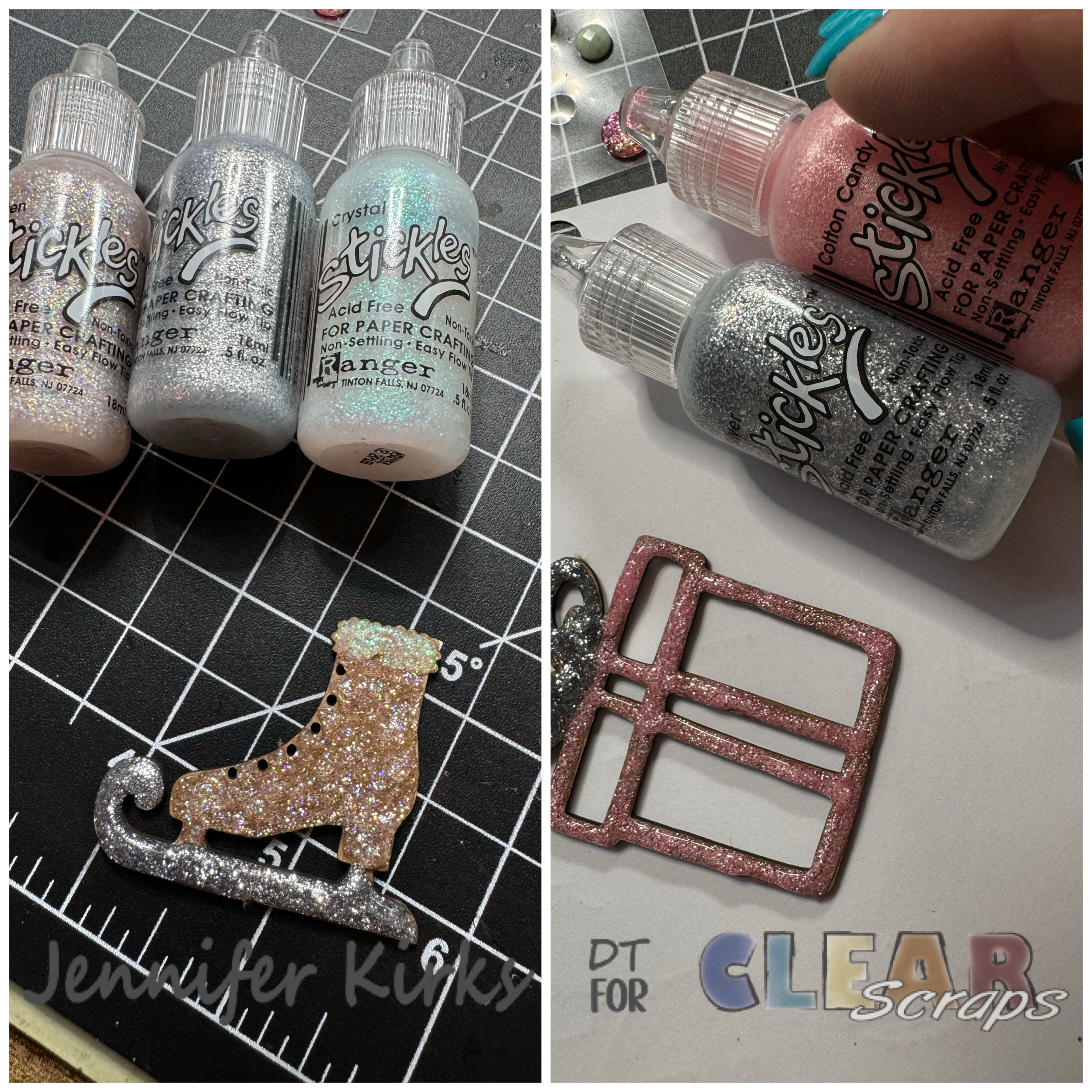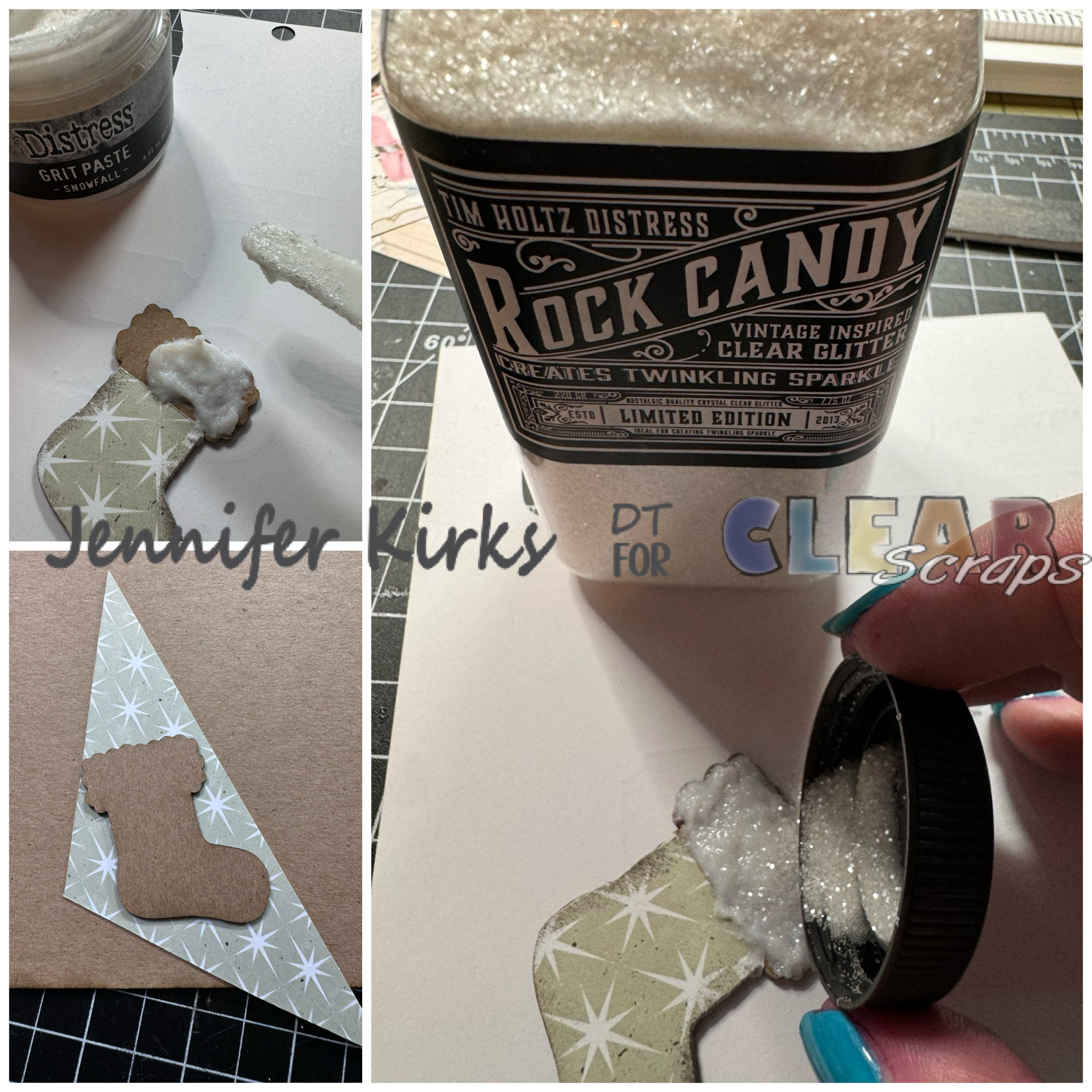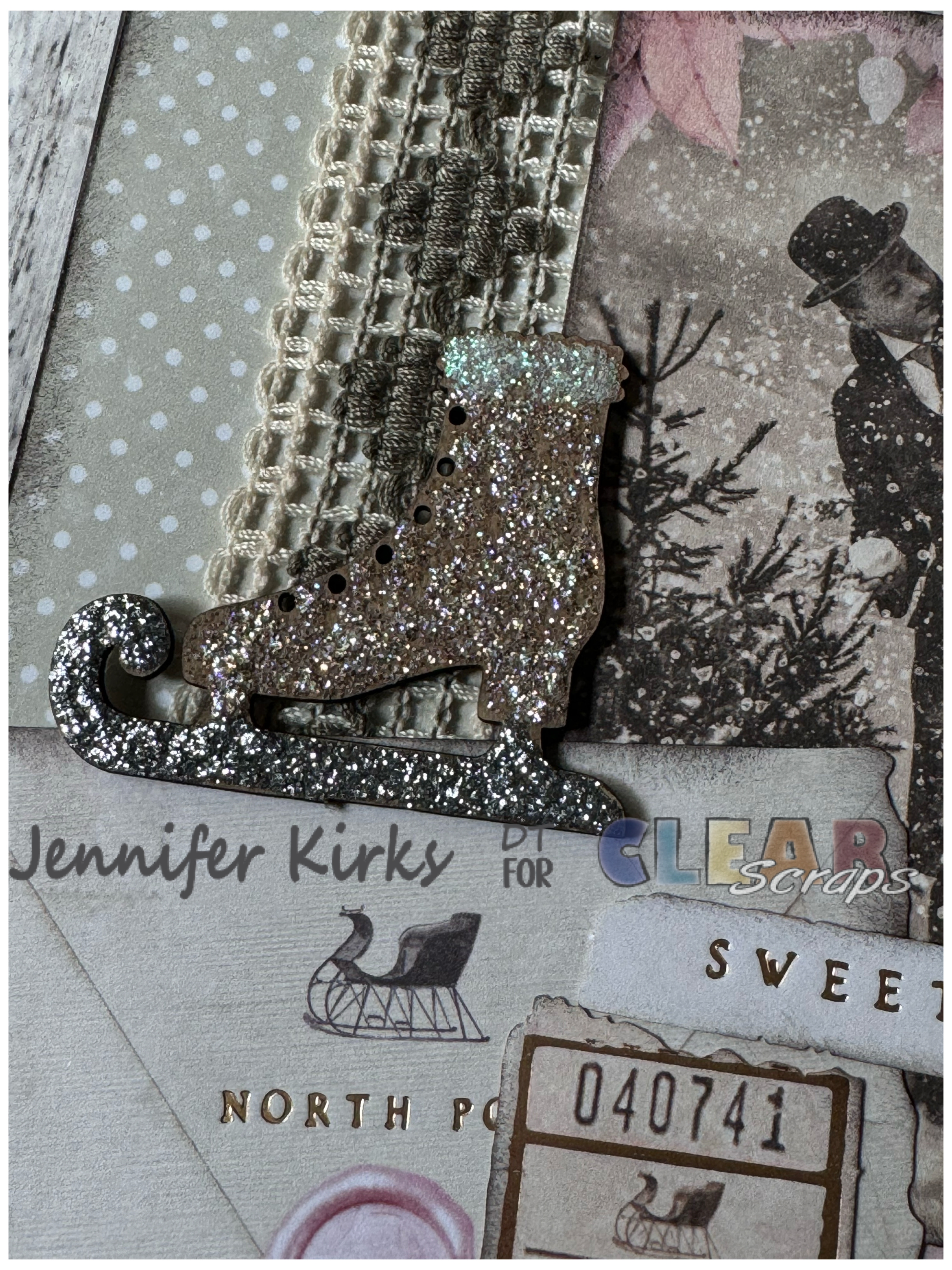 To start, I carefully selected the perfect papers for the base pages of each chipboard piece. I traced, cut, and trimmed the edges with an X-Acto knife to ensure clean lines. Then, I added a touch of warmth by inking the edges with brown StazOn ink. After gluing the base pages, I gathered the chipboard elements and began decorating them. For the present, I used pink and silver Stickles to add some sparkle. The skate was adorned with silver, light pink, and white Stickles for a festive touch. For the sweater and stocking, I selected coordinating papers to cover them. Additionally, I added grit paste and rock candy glitter to the top portion of the stocking, giving it a frosty, wintery look.