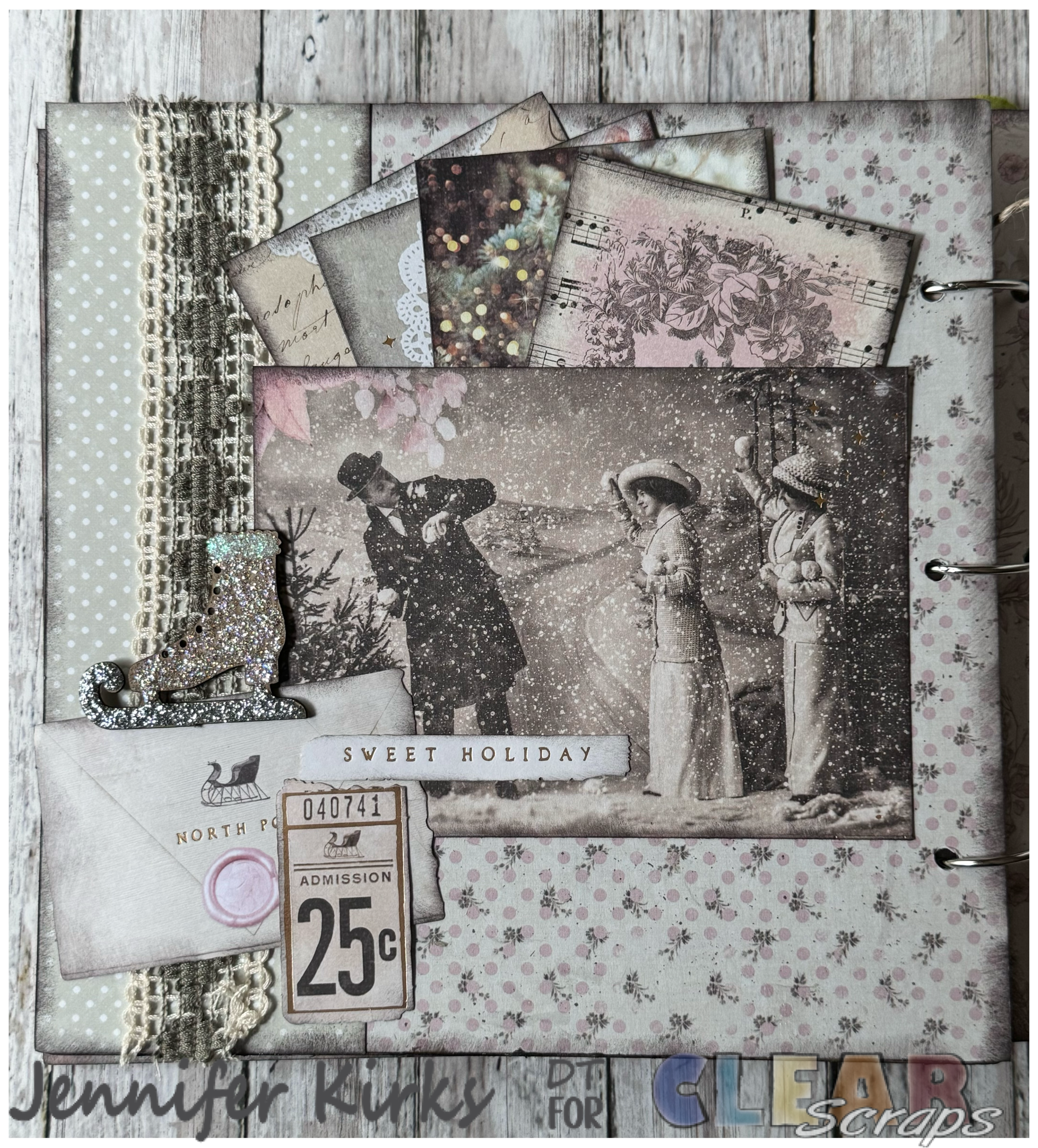For the third page, I cut out one of the postcard pieces from the collection and created a pocket by gluing only the bottom and sides. I then cut several picture cards, inked them, and tucked them neatly inside the pocket. Before gluing the pocket in place, I added a ribbon to the left side for an extra touch of charm. To finish, I selected a few die-cut pieces and added the skate chipboard element for a playful accent.For the fourth page, I decided to add extra photo mats to capture those sweet holiday moments. I embellished the page with a charming flower and several die-cut pieces, all of which I carefully inked around the edges for a polished finish.