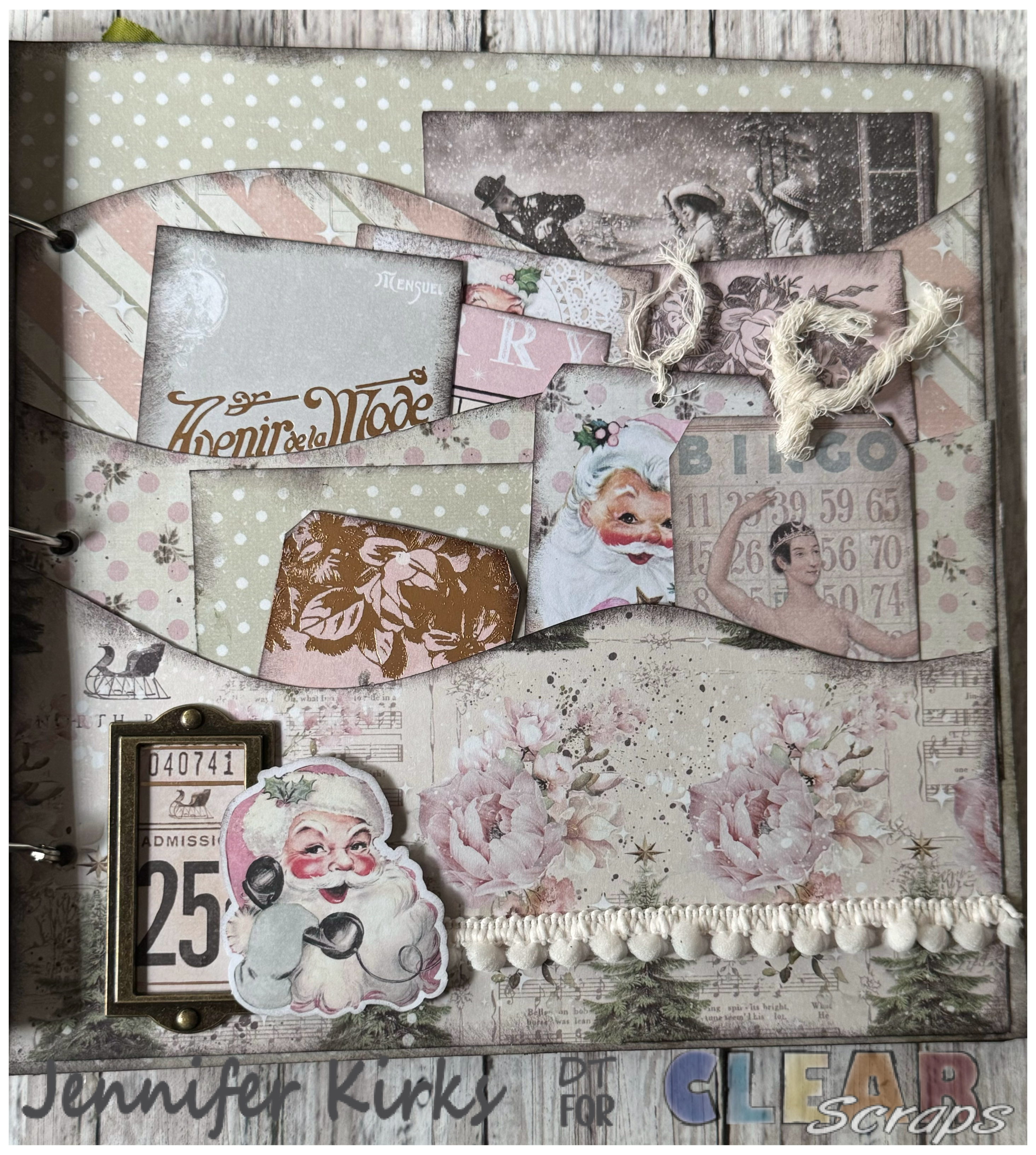 For page 5, I cut an 8×3 piece of dot paper, tore it along the edge, and inked it before gluing it to the top, bottom, and right side to create a side pocket. I tucked a few picture cards inside the pocket for journaling or photos. To complete the page, I added die-cut pieces, which I inked before gluing them down, along with the stocking chipboard element and a flower for a festive touch. For page 6, I cut three pieces of paper to 8×3 and used an X-Acto knife to cut a curved line across the 8-inch mark, creating a “wave” effect. After inking the edges, I layered and glued the pieces along the bottom and sides to form three pockets. I then selected a variety of tags, picture journaling cards, and die-cut elements to tuck into the pockets. To finish the page, I added a ribbon, a metal frame, and a Santa chipboard element for a festive touch.