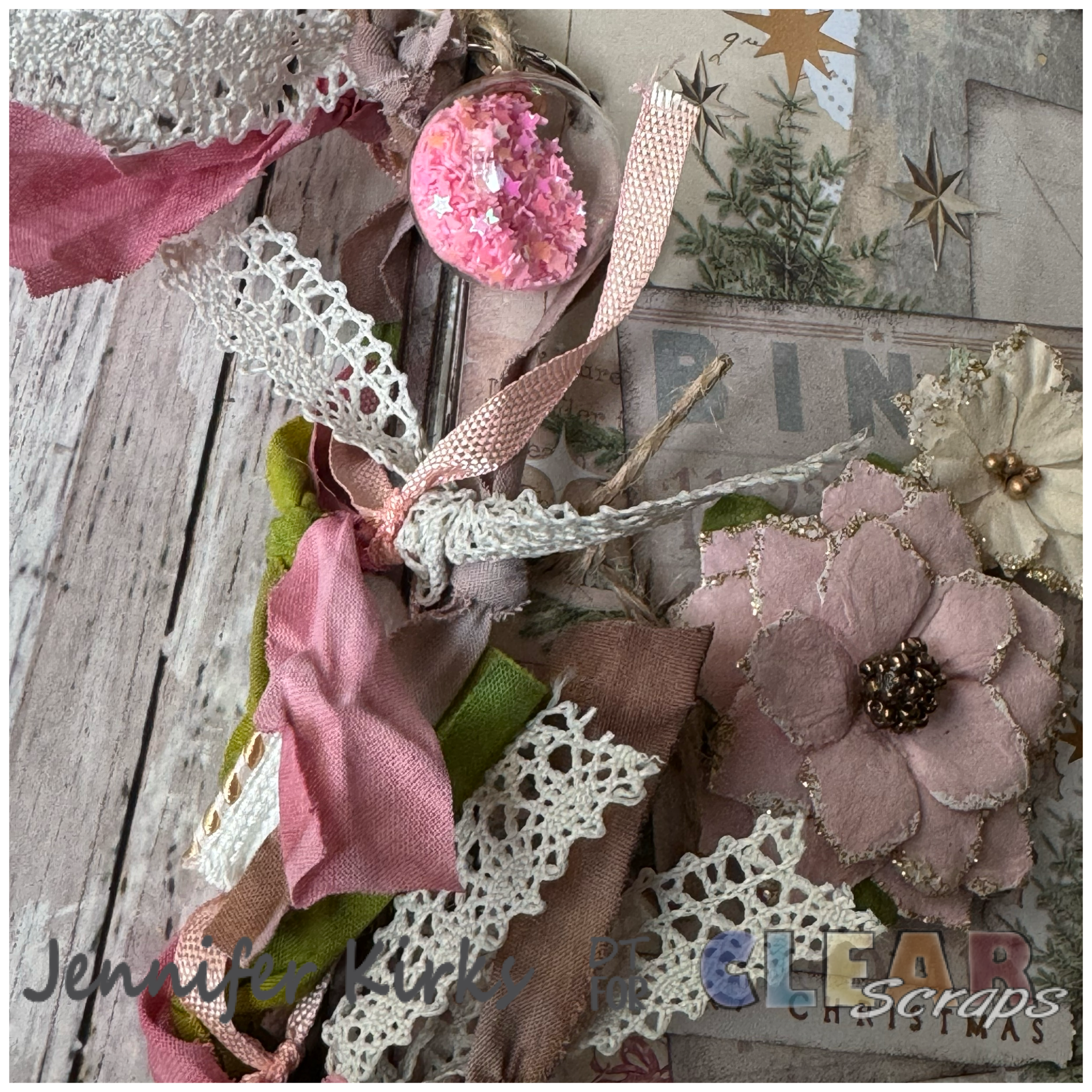For page 7, I cut a diagonal piece of paper and tore it along the diagonal edge, then inked it for added texture. I glued the side and bottom to create a pocket. Next, I cut several photo cards, inked the edges, and tucked them into the pocket. To finish, I added some die cuts and the sweater chipboard element to the bottom left corner of the pocket. For the final page, I added a photo mat and embellished it with a Santa and a banner die cut. I bound the album together with book rings, then gathered some dyed seam binding, ribbon, and lace to cover each ring. To complete the look, I added a globe filled with pink star "glitter" for a final, sparkling touch.