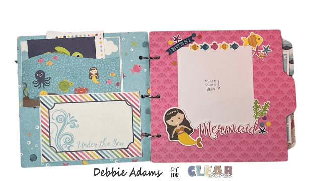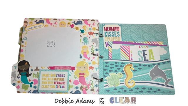 On the left hand inside page I added two flaps one opens up to left and the other opens up to the right. I did lay down some photo mats behind these. I also cut a little slit following the curve of the blue mermaid flap to create a pocket.