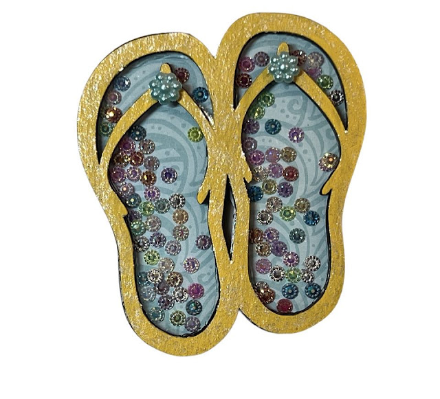 Mini Shaker Flip Flops. I painted yellow, added some glitter on top, papered the back and added the cute little pearl flowers on top of the flip flops. I added my little shaker bits. When gluing together be sure to really burnish everything down.