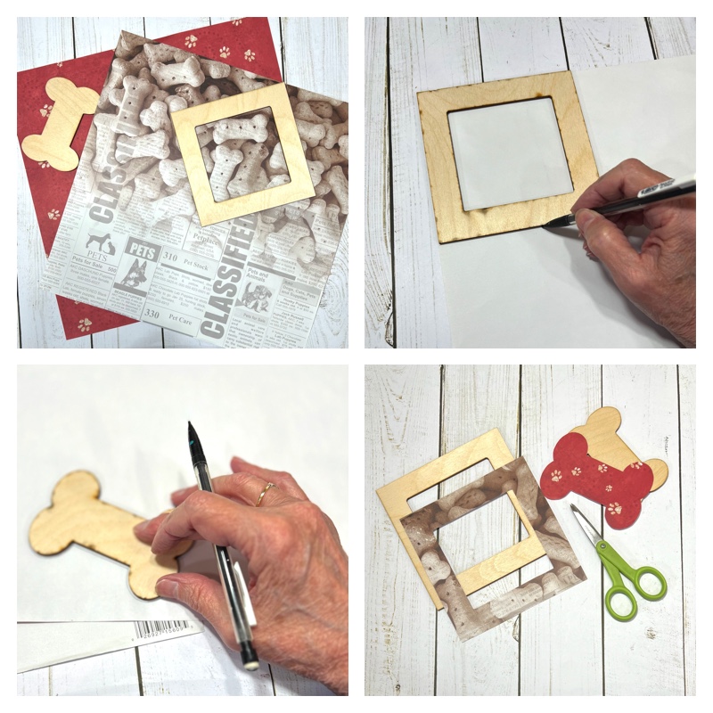 Next, I traced the frame and bone pieces on the back of the patterned papers and cut out to adhere to the front sides.