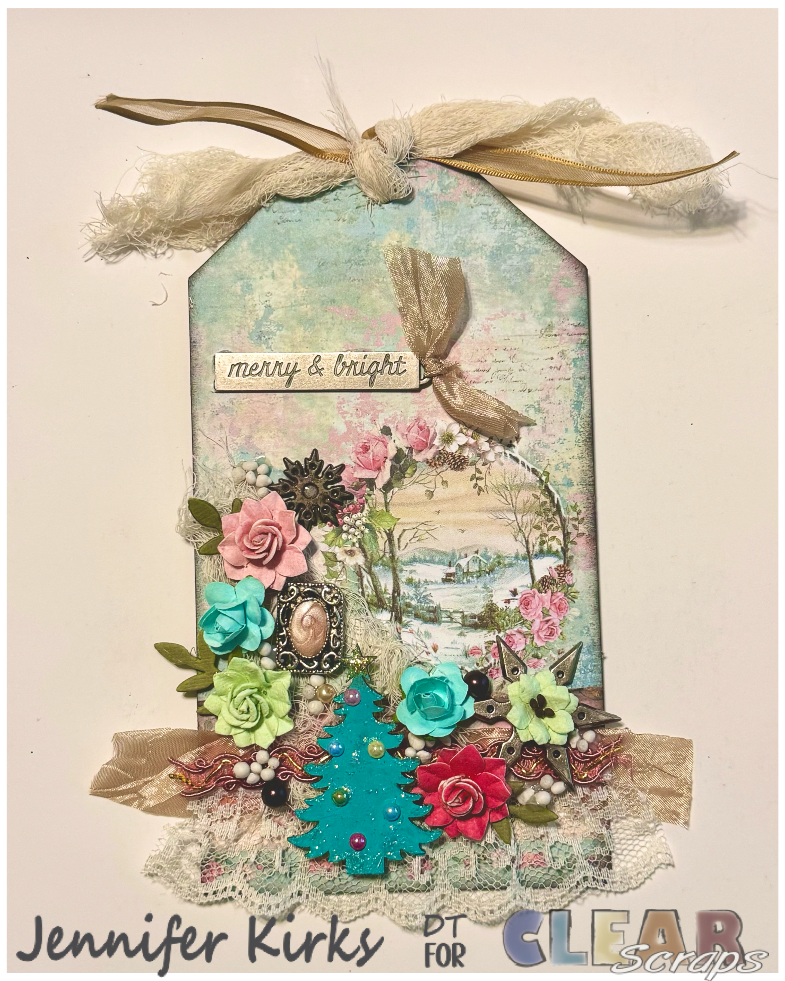 I then gathered a delightful assortment of embellishments: delicate flowers, intricate metal snowflakes, vibrant ribbon, and sparkling colored cabochons. Starting with the ribbon, I added it to the bottom of the tag, then artfully arranged the flowers and other elements to frame the lower portion of the Christmas image on the tag.