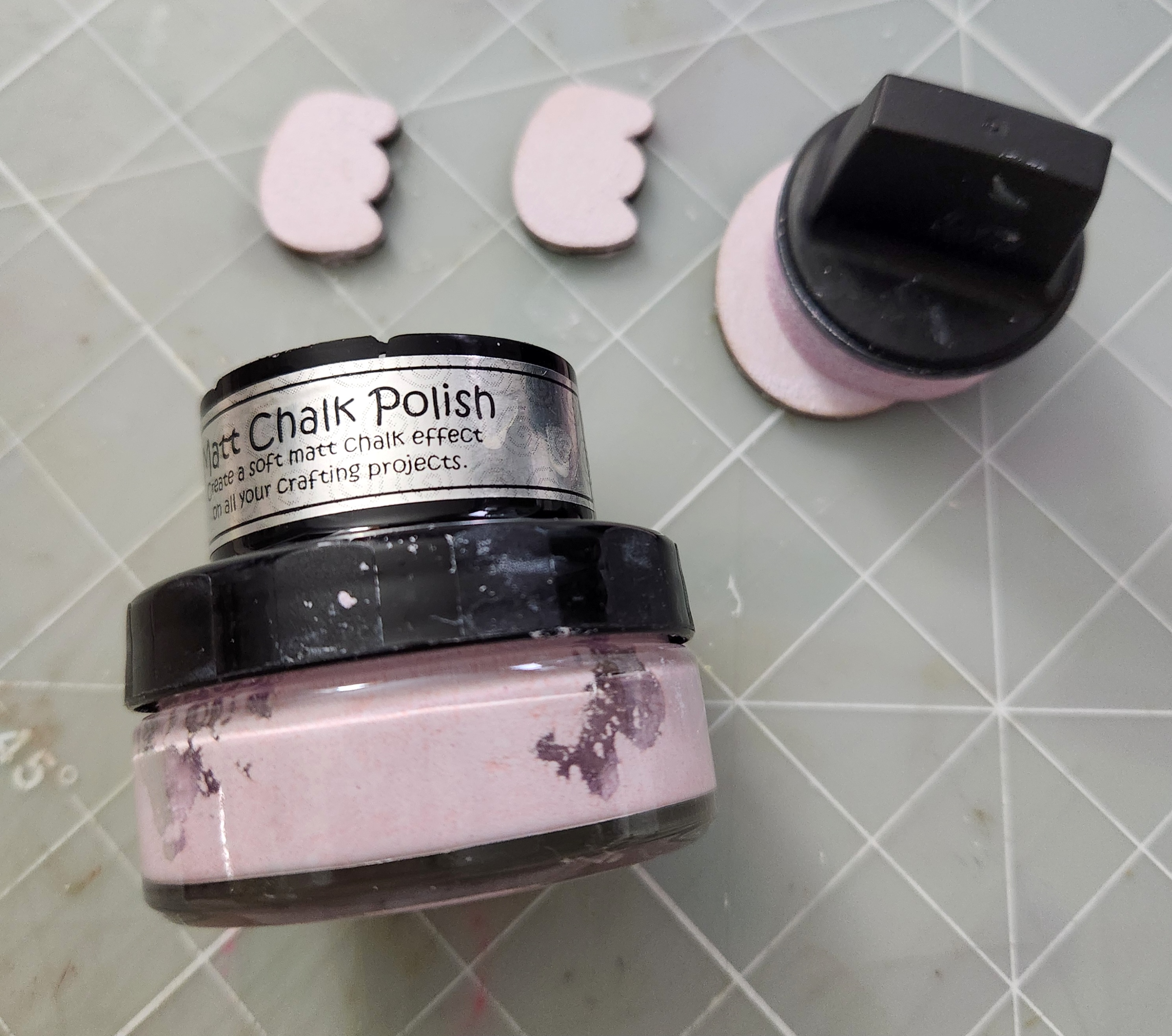 To begin, remove all your Wood Gnome pieces from your package. Take the hands, nose and apply Cosmic Shimmer Ballet Slipper Chalk paint over the top and sides using a sponge dabber. See photo: