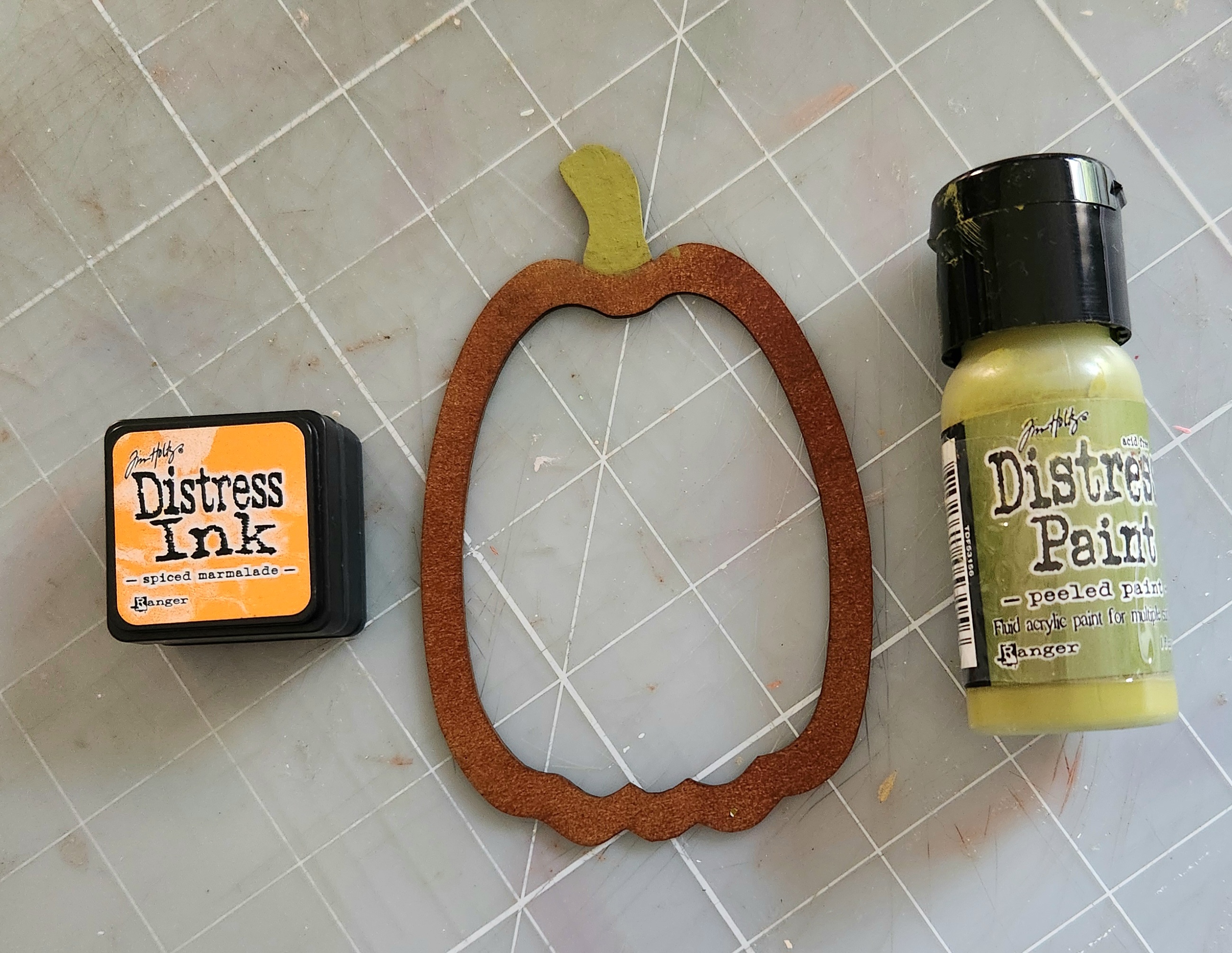 Take your top shaker Pumpkin piece, and on the stem I applied some Tim Holtz Distress Paint- Peeled paint and on the pumpkin body I applied Tim Holtz Distress Ink Spiced Marmalade. Here's a photo:
